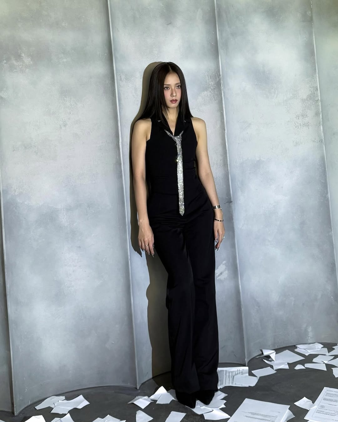 Jisoo以一頭齊瀏海配以深色唇膏的造型非常有新鮮感,她身穿小眾品牌 Lado Bokuchava 2024 Resort 度假系列的套裝,再搭配同品牌的長靴,輕輕露出小蠻腰性感又帥氣!
