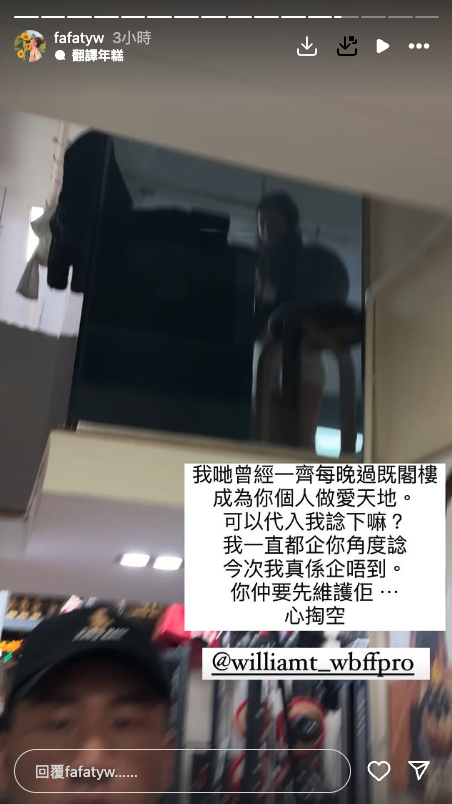 之後FaFa再貼出影片並表示「上PT唔洗著褲」,可見她在健身室中,但一地都是衣服,之後她轉角準備上樓梯,就見到一名健壯的男士走下來,相信就是FaFa的老公。除此之外,影片中右上角閣樓位置有一名女子閃閃縮縮,相信這位就是FaFa所指的吳泳。