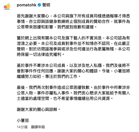 不過不少網友認為今次事件令到小薯茄被無辜牽連,稍早前小薯茄亦在IG發出聲明指「首先謝謝大家關心,本公司與旗下所有成員同樣透過報導才得悉事情,亦立即與該健身教練終止個別成員的贊助合作,就事件為公眾帶來困擾和影響,我們感到抱歉和遺憾。鑒於網上出現有關本公司及旗下藝人的不實消息,本公司認為有澄清之必要。本公司及成員對事件並不知情亦不認同,在此嚴正聲明,對於坊間誣蔑參與或涉及任何違法行為更屬無稽,本公司將保留一切法律追究權利。基於事件不牽涉本公司成員,以及涉及他人私隱,我們及後將不會對事件作任何回應,謝謝大家的關心和體諒。最後,我們再次對事件造成公眾困擾致歉。由於事件中所牽涉非公眾人物,事件亦屬私人事件。我們衷心懇求大家能給予有關人士適當的處理空間,也不希望事情繼續佔用公共資源。謝謝大家的關心與諒解。」