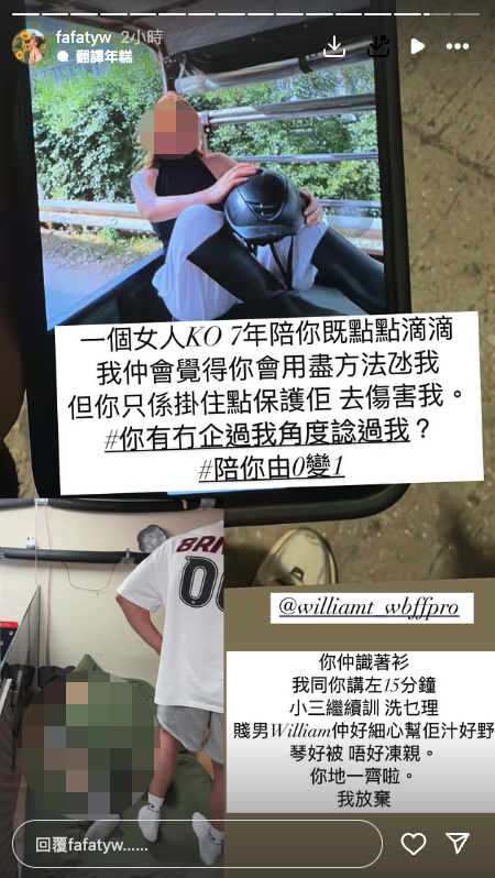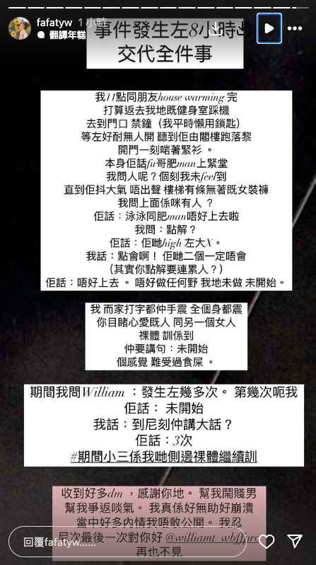 FaFa最後再發文交代整件事,透露老公承認已經三度出軌,又指自己已經陪伴對方7年,支持對方追夢,兩人在上年11月結婚。最後再發文稱:「其實我真係唔再適合佢,因為我唔再有新鮮感俾到佢,我只係希望唔好有下個學生Flirting pt 同偷食。」、「親眼見到我真係崩潰,全身震曬就快要暈。」事後男方的IG轉為私人。