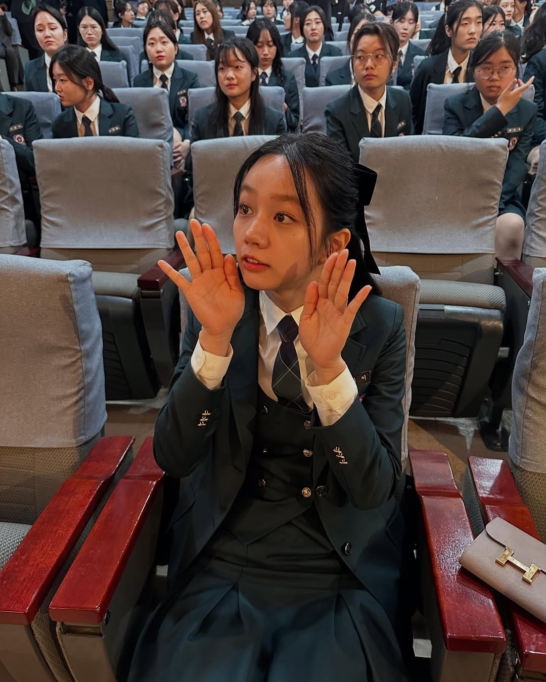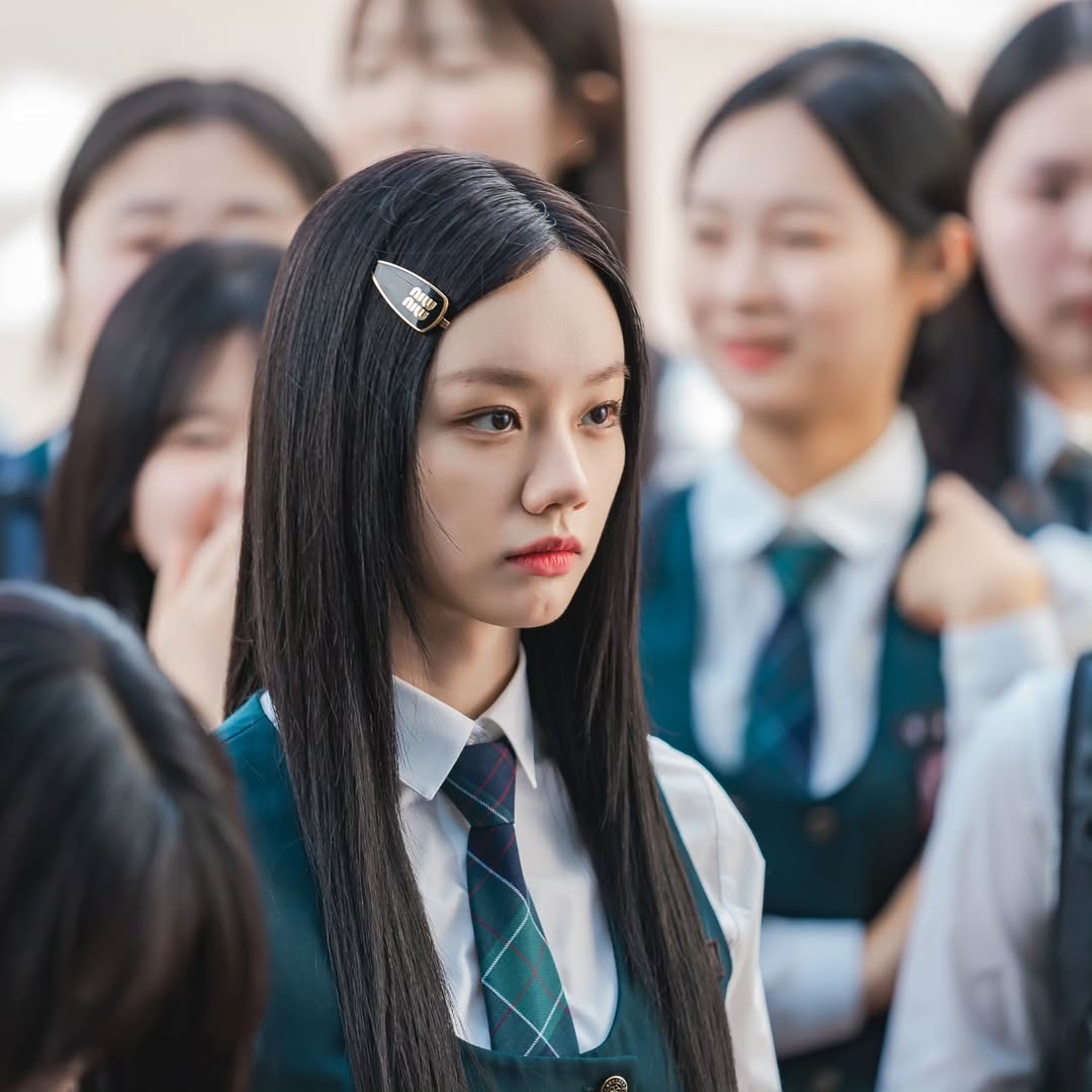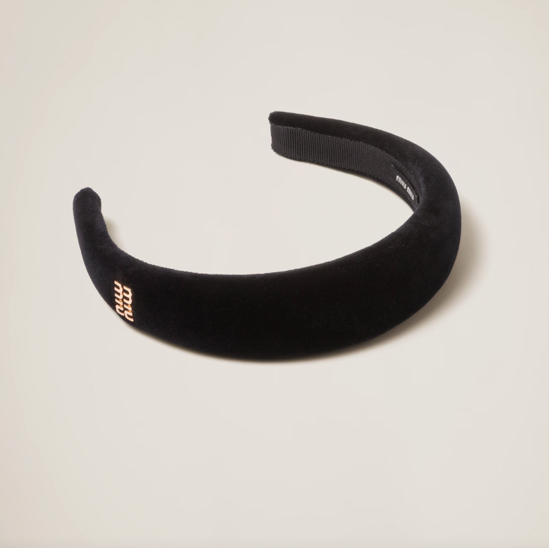 Miu Miu這款絲絨頭帶以點綴設計的字樣標誌脫穎而出,增添標誌性的特色,與惠利的校服造型非常合適呢~