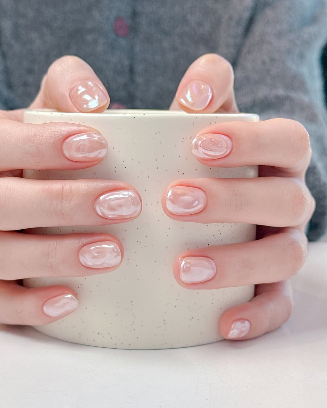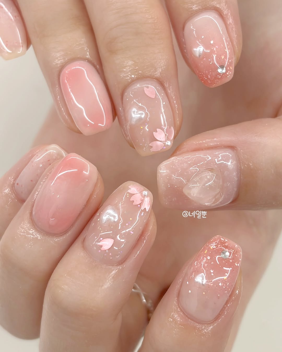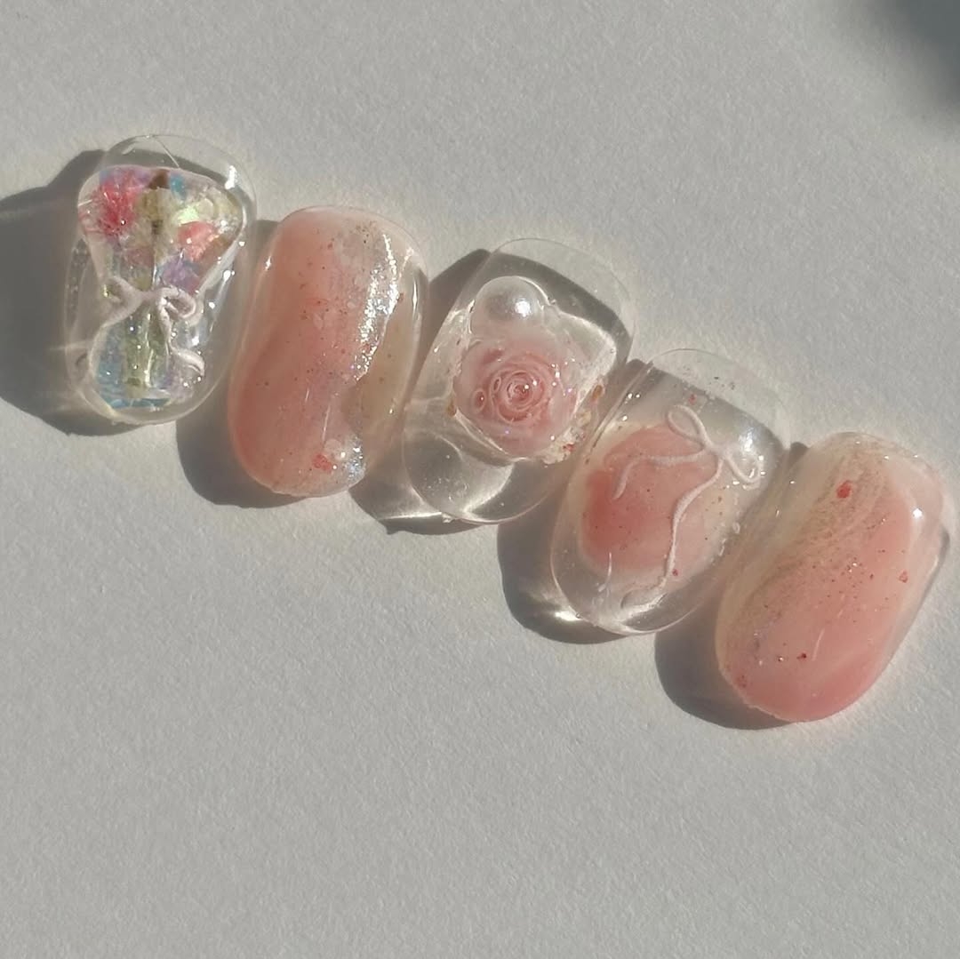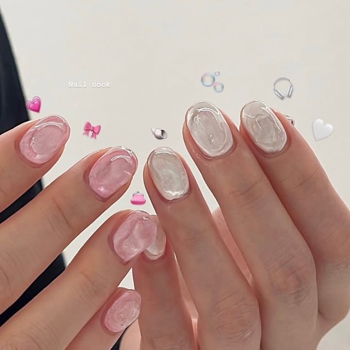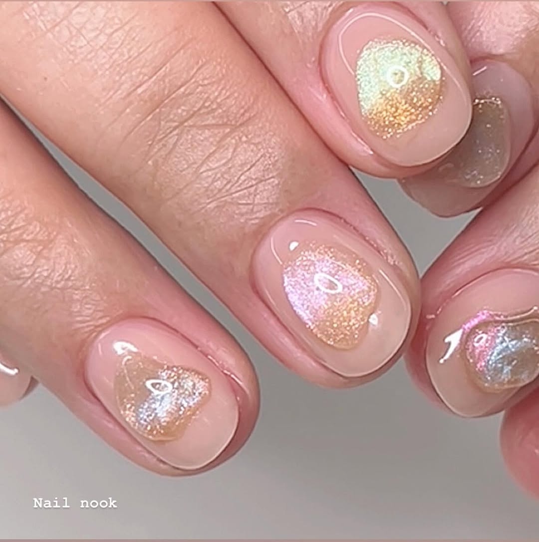 強調晶瑩剔透的光澤感,像是果凍一樣有著 水潤Q彈的質感。常見的款式有透明裸色底,加上微閃粉、珍珠光澤、貝殼紋理,看起來乾淨又高級,適合想要低調卻又帶點精緻感的女生!