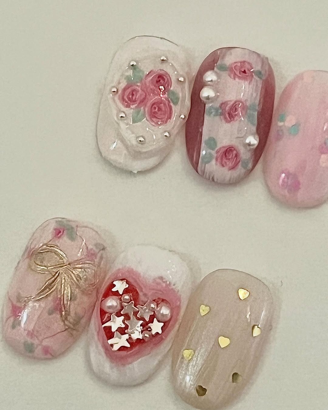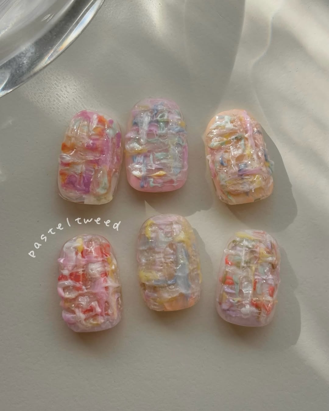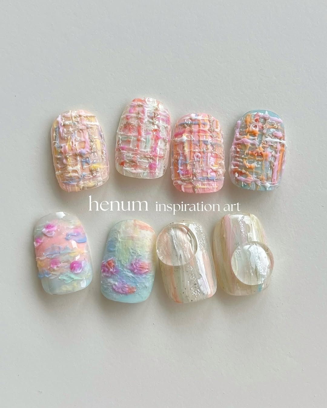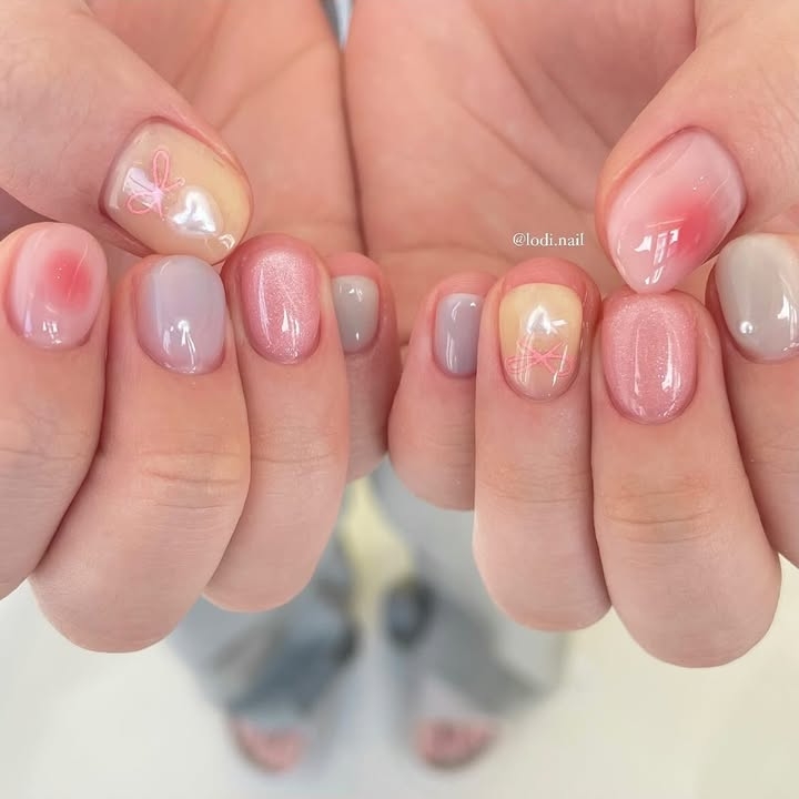 以粉色、淡藍色、檸檬黃、薰衣草紫等馬卡龍色調 為主,整體呈現輕盈透亮感,有時會搭配法式線條、愛心、雲朵或珍珠點綴,展現甜美活潑的氛圍。適合春夏穿搭,讓手指變得更加可愛,又帶點調皮感!