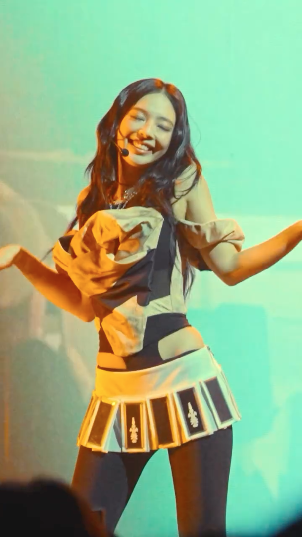 另一套引起熱議的舞台造型一定是黑色內衣外穿配黑色長皮褸的造型,下身配黑色低腰裙褲,短裙採用鏡面金屬元素點綴,給人一種未來感,像女戰士般霸氣,同時大曬小蠻腰,超好身材令人目不轉睛,展現出Jennie性感又前衛的風格!而同一套穿搭更是延伸出不同造型,不論是搭配皮長褸、恤衫還是花邊上衣,都各顯魅力!