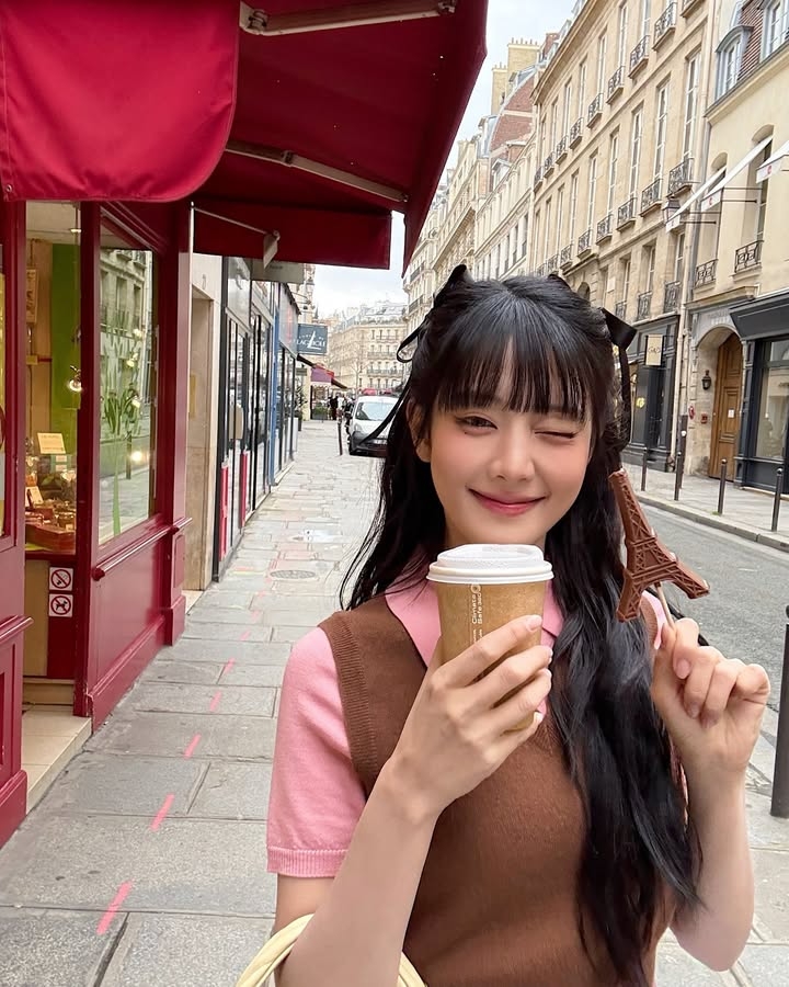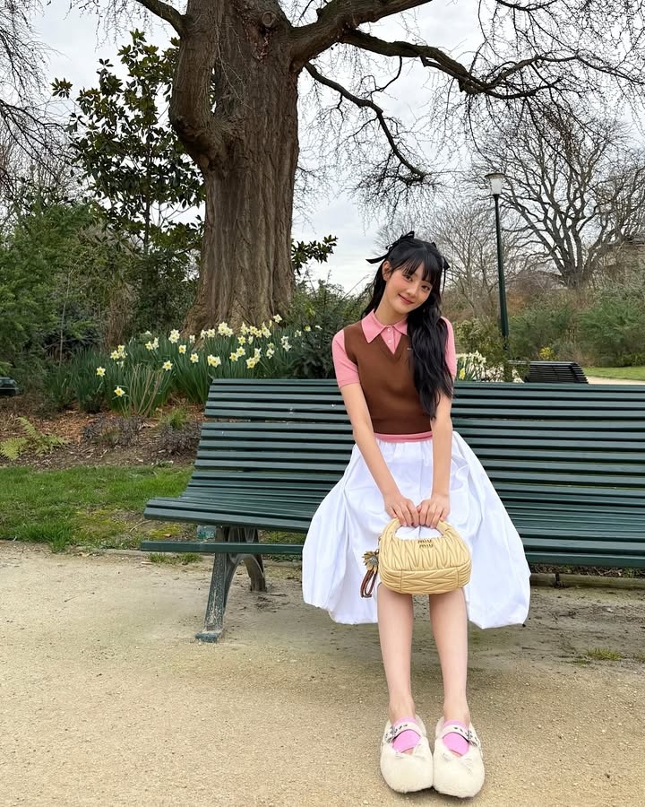 (G)I-DLE的Minnie擁有甜美的形象,她選擇的棕色背心冷衫搭配粉色針織是另一個典型的可麗露風穿搭。棕色的背心冷衫散發出一種成熟的魅力,而粉色針織則帶來一抹柔和的女性化感覺。這樣的組合讓整體搭配看起來既輕盈又不失溫暖,非常適合春夏季節。