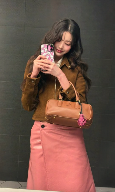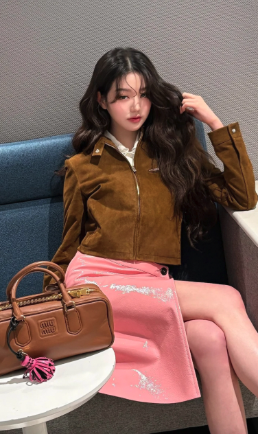 IVE的張員瑛以棕色麂皮外套搭配粉色漆皮裙,這樣的搭配顯得既摩登又充滿魅力。棕色麂皮外套是經典單品,為整體造型增添了一份復古的氣息,而粉色漆皮裙則為整體造型注入了一絲青春與活力。這樣的搭配非常適合春夏季節,展現了既成熟又甜美的風格!