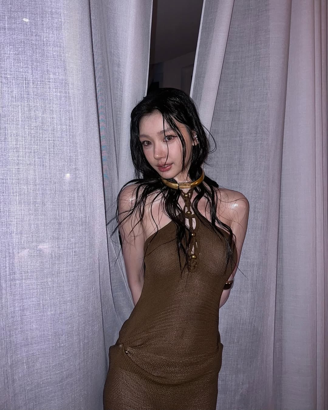 在ISABEL MARANT時裝秀中,易夢玲以一頭濕髮造型現身,身穿貼身棕色連身裙配以駝色長靴,再加上同色系飾物,展現出獨特氛圍感!她的白晢肌膚加上凹凸有致的魔鬼身材,在現場吸引了不少人的目光!難怪在活動結束後,會有知名的韓國攝影師忍不住在IG發文問道:「有誰知道這是誰?在巴黎時裝周看到的女神」該影片甚至在韓網引發熱烈討論,有網友更表示她像aespa Karina與演員金裕貞的結合體!