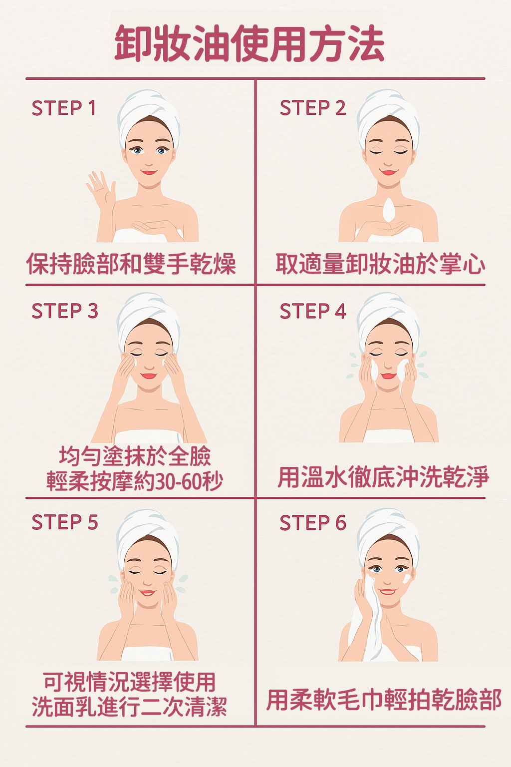 乾性肌膚: 選擇含有滋潤成分的卸妝油,例如橄欖油、山茶花油、玻尿酸等,避免卸妝後皮膚乾燥緊繃。