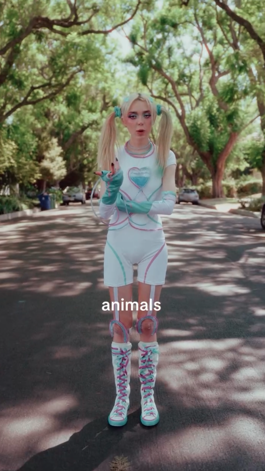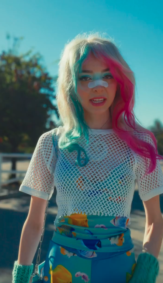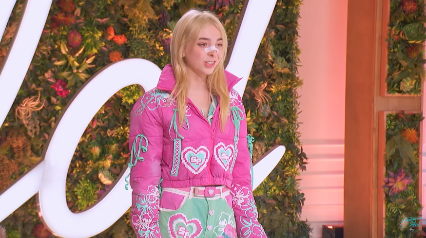 在《美國偶像》中她穿了粉色短版羽絨外套,上面用了綠色蝴蝶結和花朵、愛心圖案來點綴,又印了她的名字「SP」;下身則穿了薄荷綠色長褲,Y2K的造型非常吸睛~當中最吸睛的一定是她在鼻樑貼了膠布,原來是她第一隻專輯《Glitch : Vol1》的重要標誌,象徵著童趣和叛逆的結合~