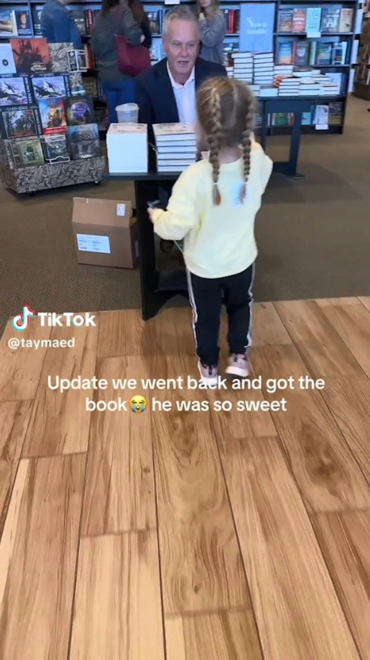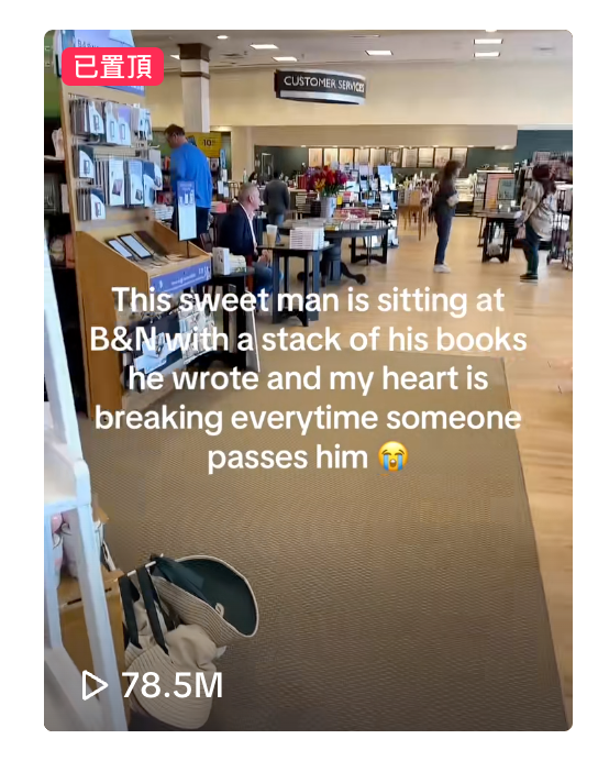 Taylor Mae表示「這位可愛的男士正坐在Barnes & Noble書店,面前擺著一疊他親手寫的書,每次有人經過他身邊時,我的心都要碎了」。除了分享影片,Mae更當場買下Stanley的書,並讓自己的女兒向他索取簽名,為他打氣。讓Stanley非常感動!