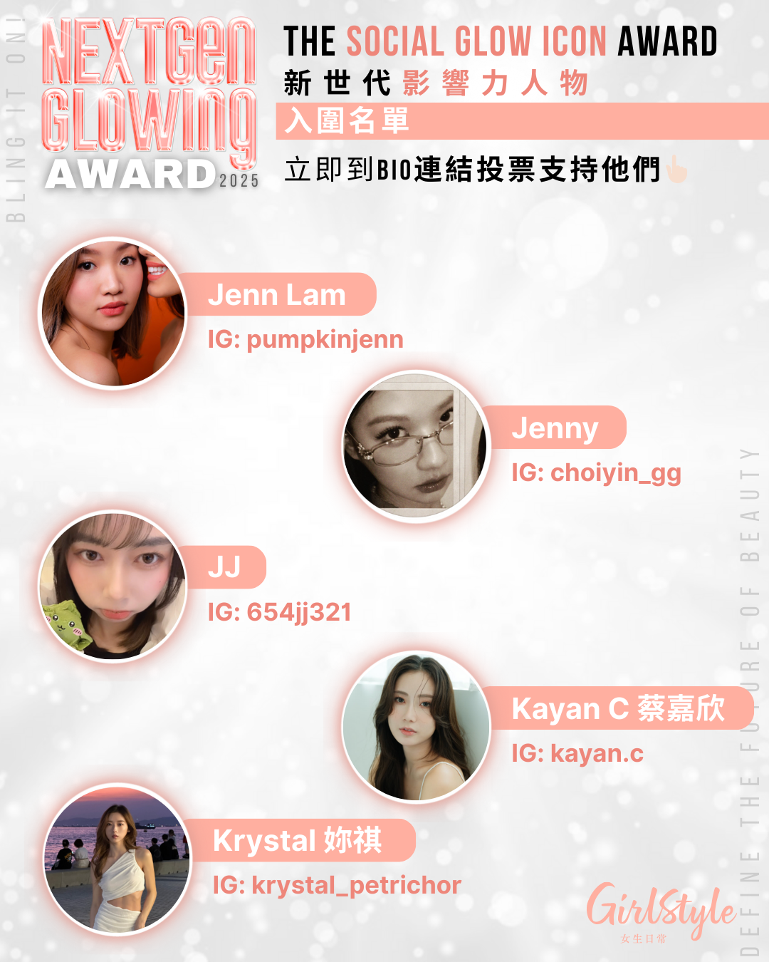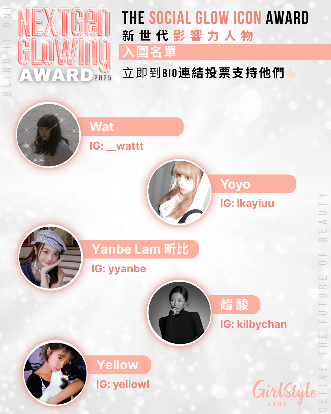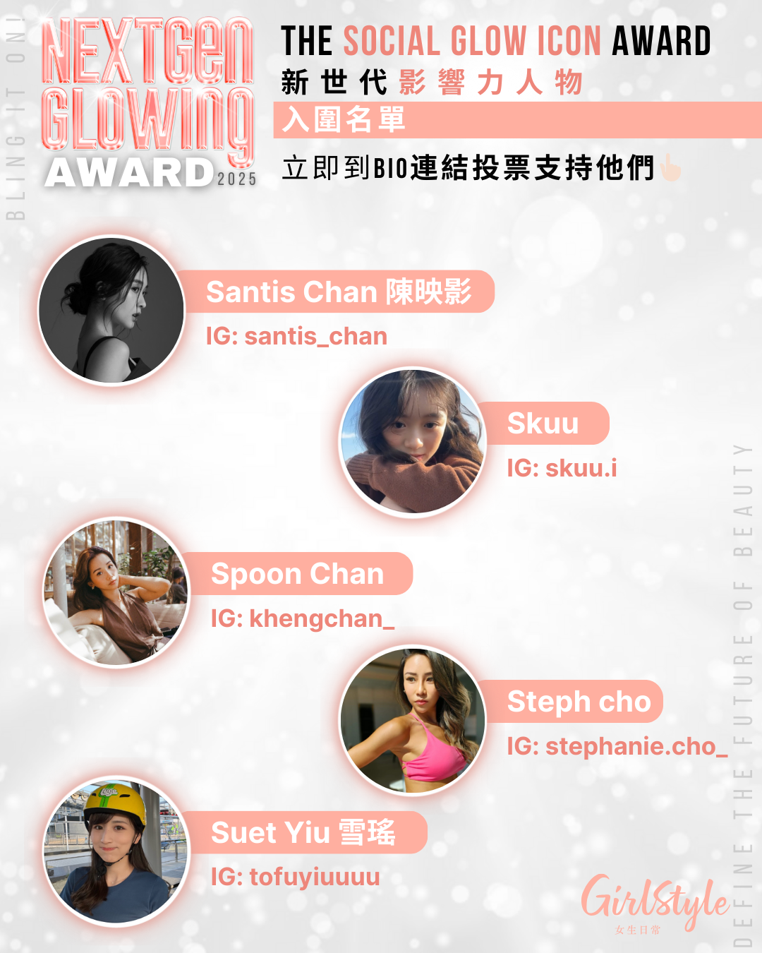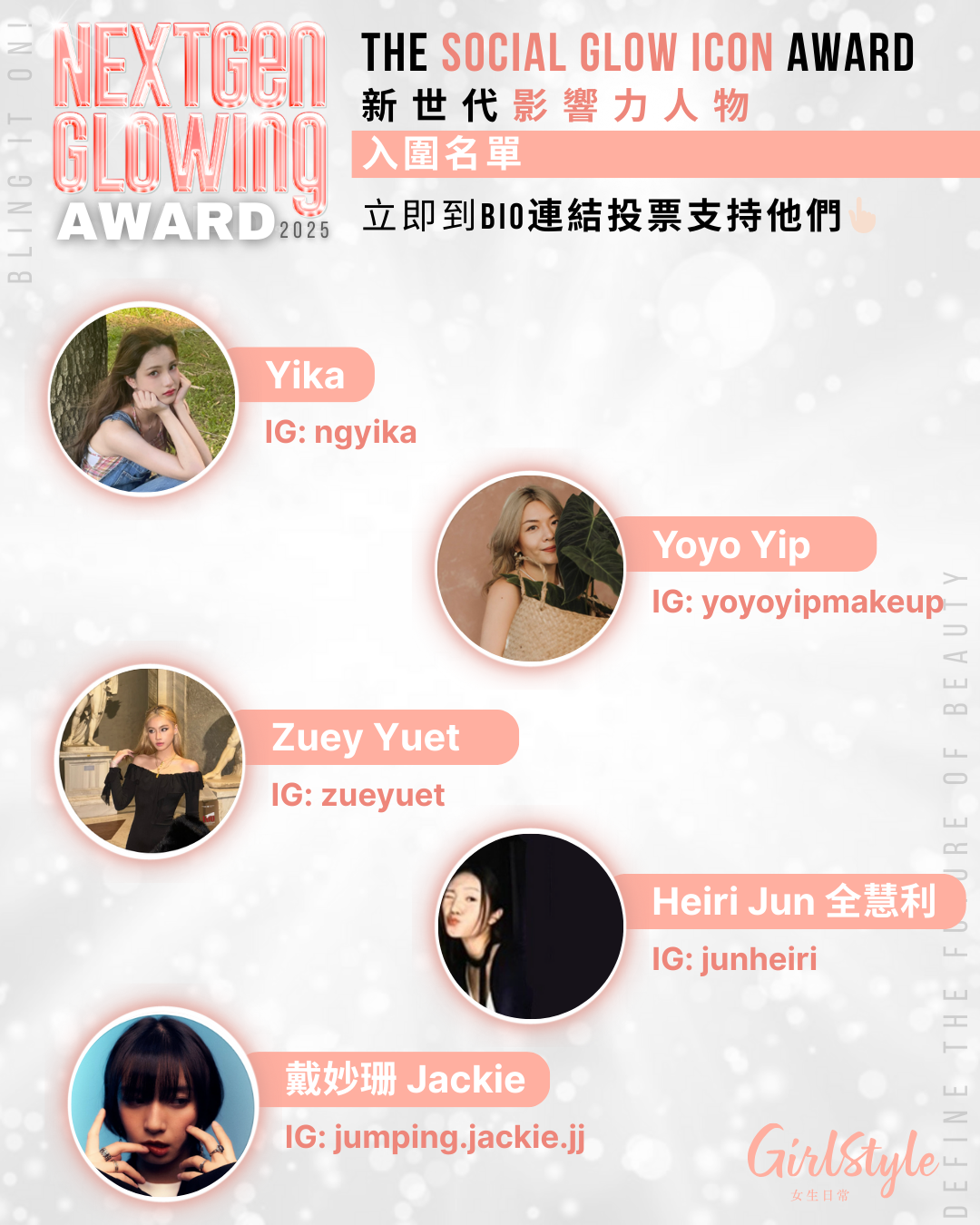 GirlStyle女生日常首屆美容大獎,特設【The Social Glow Icon Award 】新世代影響力人物致敬那些用影響力啟發、傳遞美麗、創造價值的時尚與美容時尚 KOL及達人💄!多謝大家熱烈參與早前的網上提名!💕 現在我們超興奮為大家揭曉 The Social Glow Icon Award 入圍名單 🎉!這些 KOL 憑藉創意與影響力,✨在美妝與時尚界散發著屬於自己的光芒,你的一票將決定誰能登上 Top 10 最受歡迎 KOL榜單! 🔥 即刻點擊👉連結投票 支持你心目中的最強KOL! 最終獲勝者將於 2025 年 5 月中旬 公佈🌟