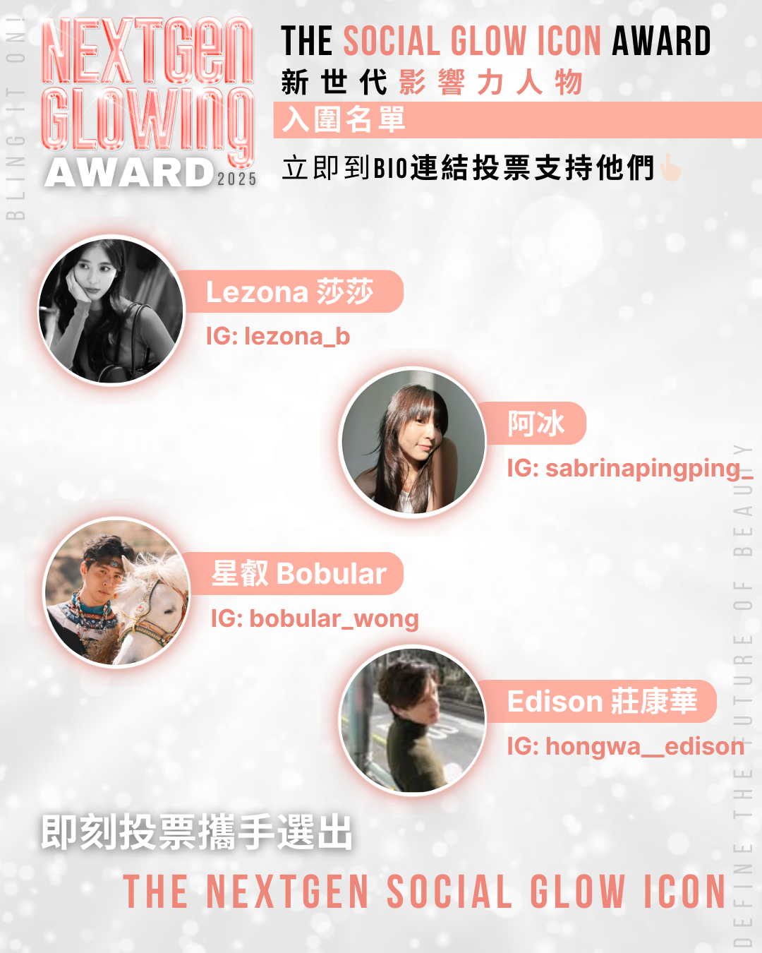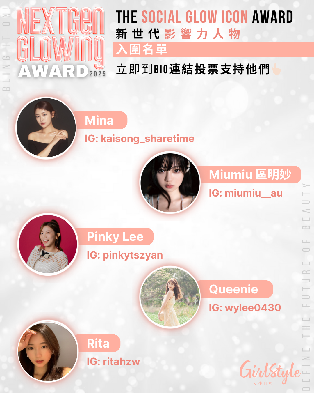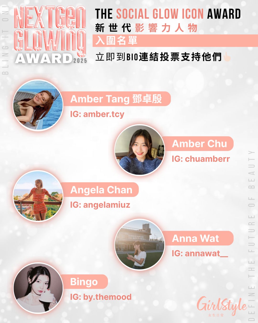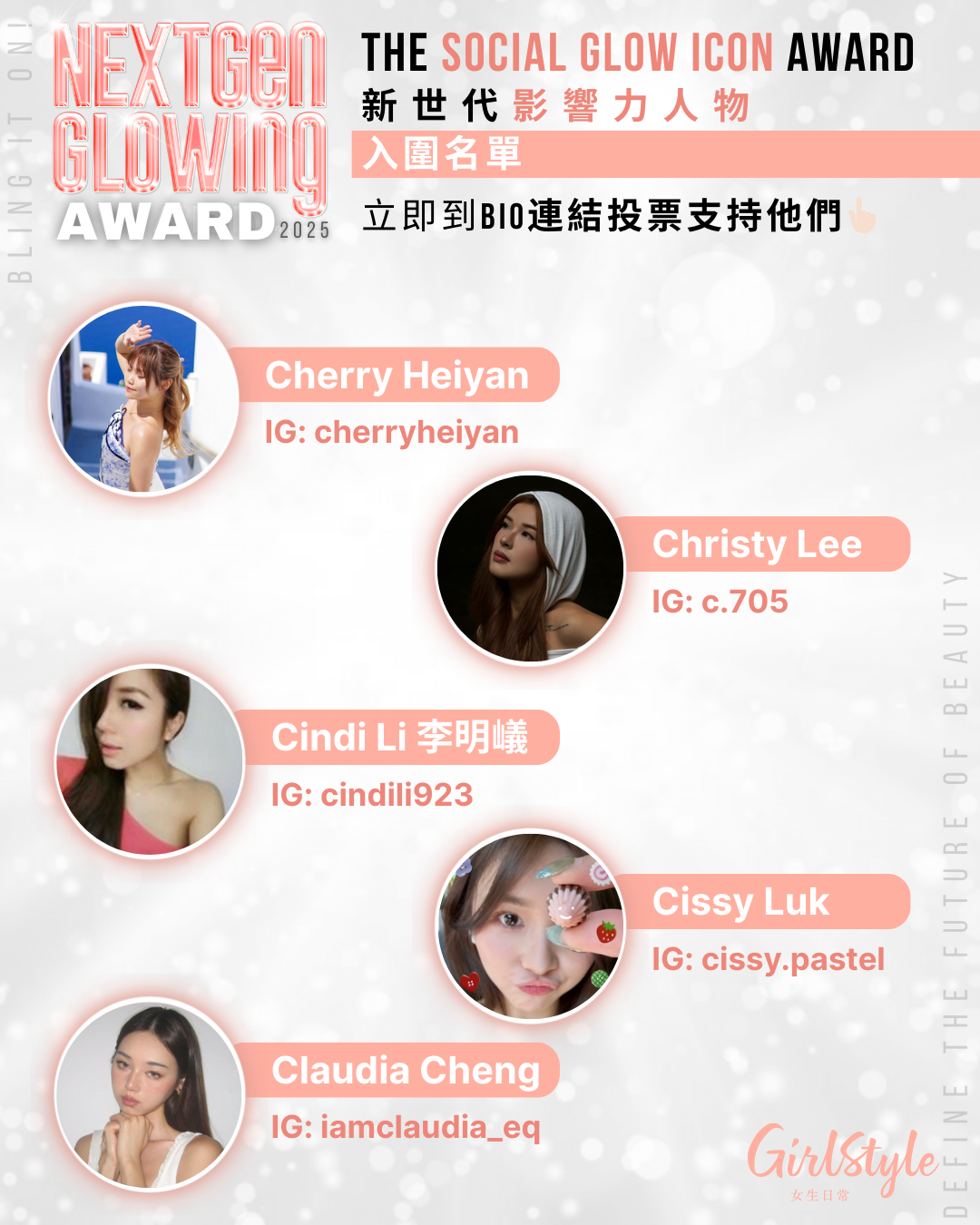 GirlStyle女生日常首屆美容大獎,特設【The Social Glow Icon Award 】新世代影響力人物致敬那些用影響力啟發、傳遞美麗、創造價值的時尚與美容時尚 KOL及達人💄!多謝大家熱烈參與早前的網上提名!💕 現在我們超興奮為大家揭曉 The Social Glow Icon Award 入圍名單 🎉!這些 KOL 憑藉創意與影響力,✨在美妝與時尚界散發著屬於自己的光芒,你的一票將決定誰能登上 Top 10 最受歡迎 KOL榜單! 🔥 即刻點擊👉連結投票 支持你心目中的最強KOL! 最終獲勝者將於 2025 年 5 月中旬 公佈🌟