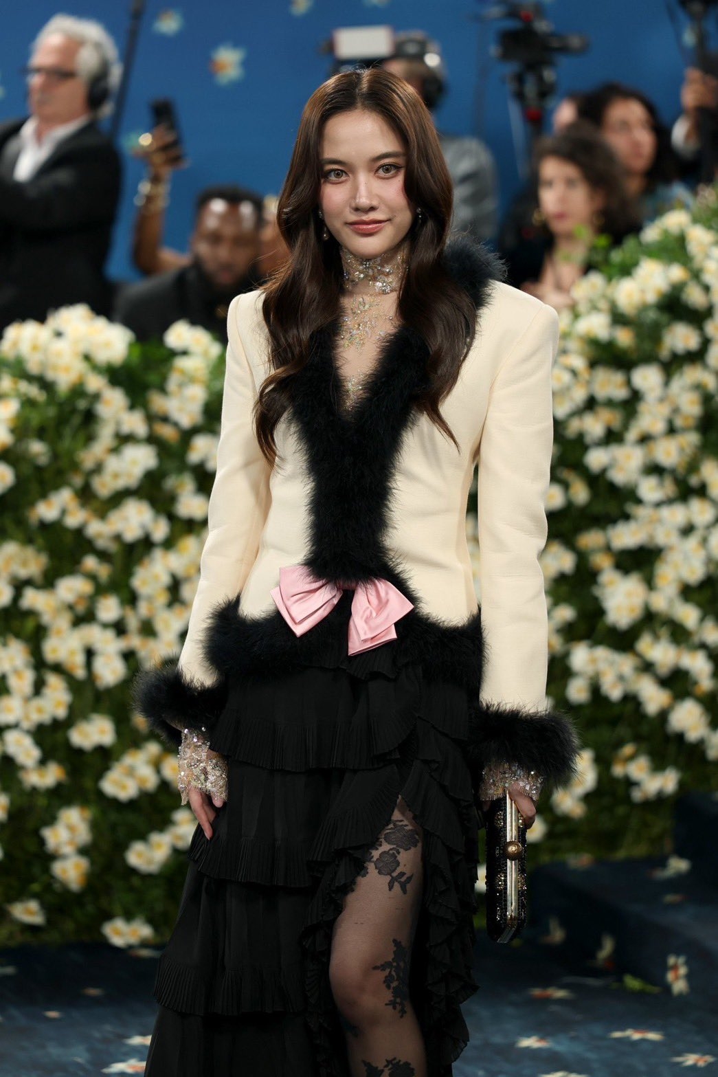 今年Freen 還獲邀出席一年一度的時尚盛事 Met Gala,是繼Pan-Nichaphat 和 Bright-Vachirawit後,首位以Valentino品牌大使身分出席Met Gala的泰國女演員,可見她的影響力有多大~而Freen作為Valentino的品牌大使,以高定造型登場,身穿的禮服是由 ALESSANDRO MICHELE為她定制,將黑白色西裝外套結合黑色毛絨滾邊,搭配一條黑色帶荷葉邊的高衩拖地長裙,內搭透膚單品及粉紅色蝴蝶結作點綴,展現出甜美又性感的魅力,相當吸睛~