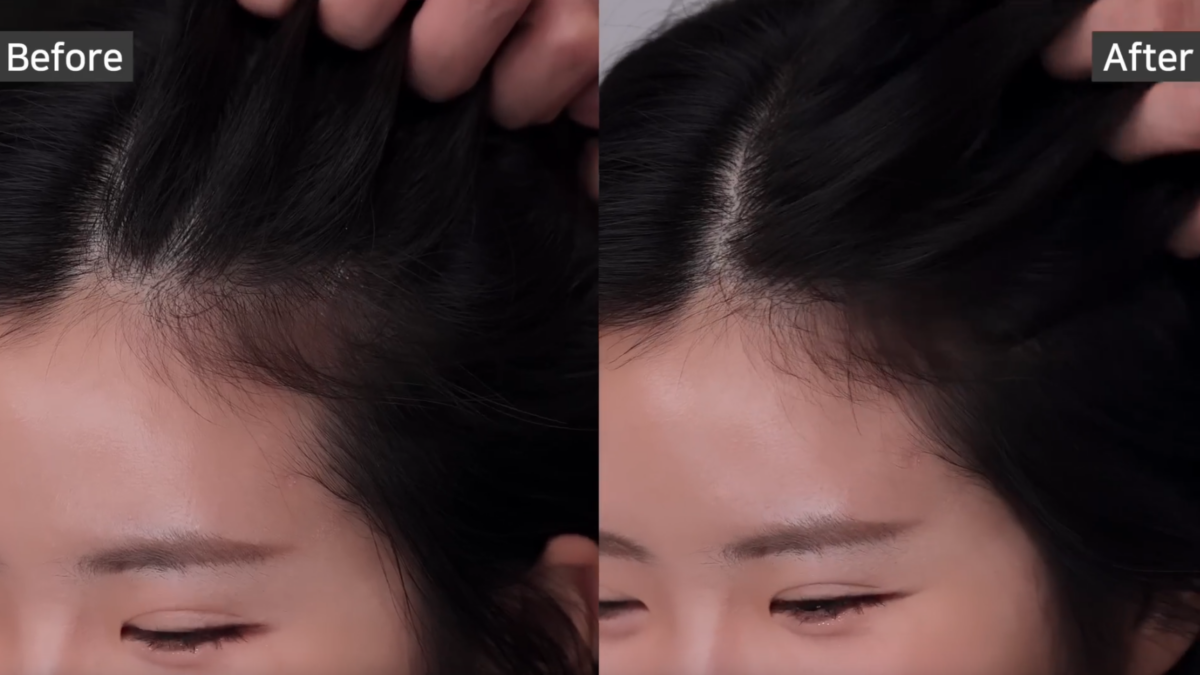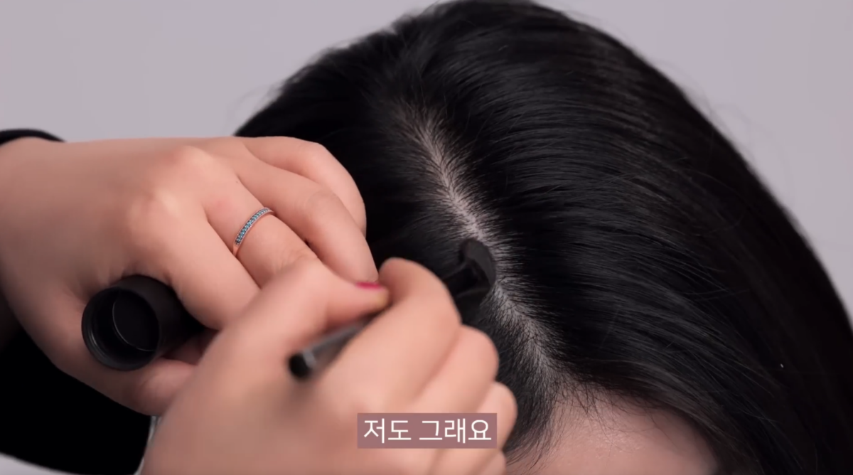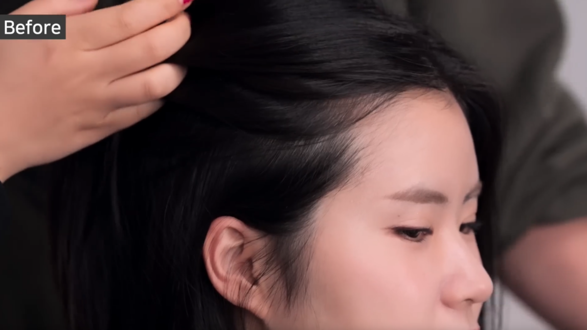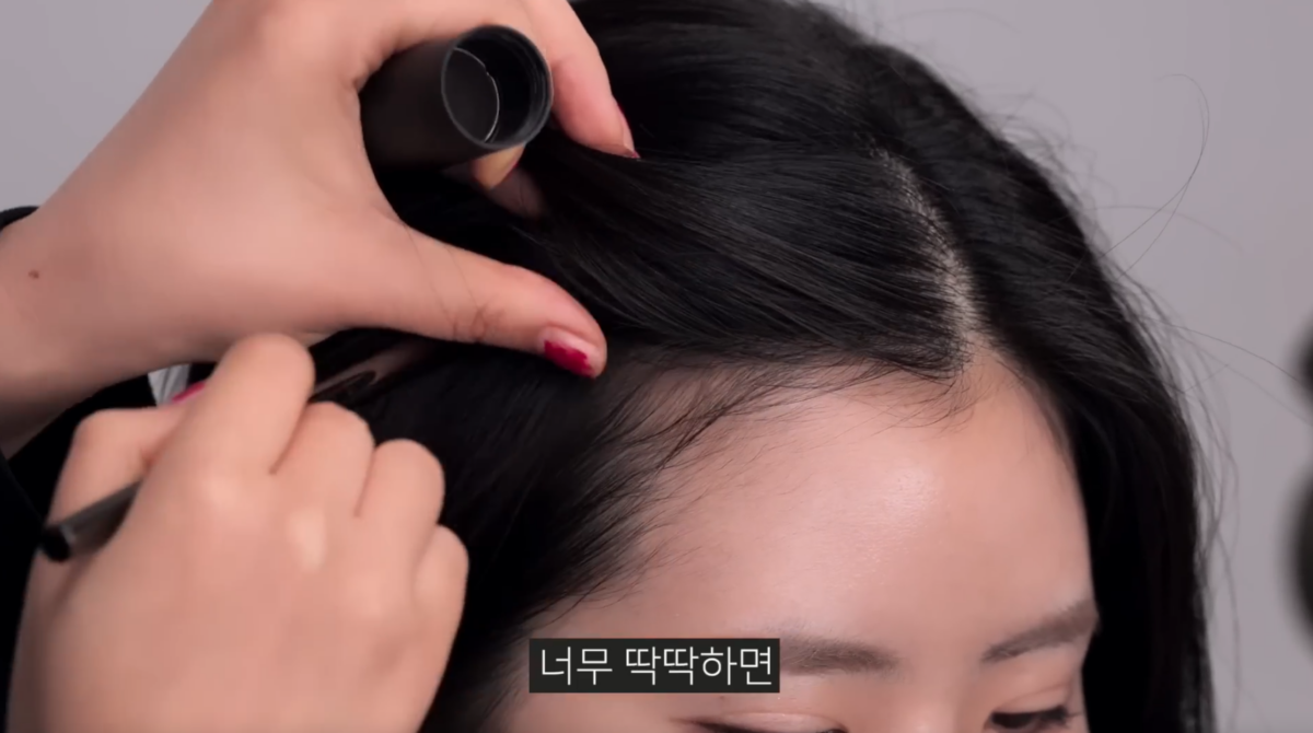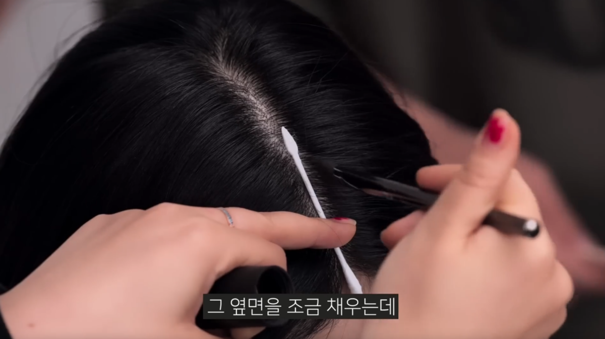 在「기우쌤」kiu的影片中,可見模特兒撥起側面頭髮的時候,明顯頭髮比較少、甚至出現髮縫,髮型師會用斜角刷具沾上與髮色相近的髮粉,再用點刷方式填補髮縫,有個小Tips是先填滿頭髮根部位置,再慢慢暈染至額頭,會比較自然哦!大家亦可以加深鬢角位置,更有顯臉小的效果~