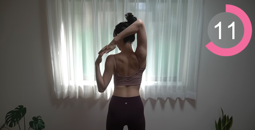 第八個動作同樣先將雙手合十,然後輪流左右伸展,會感受到後背肌肉的伸展。