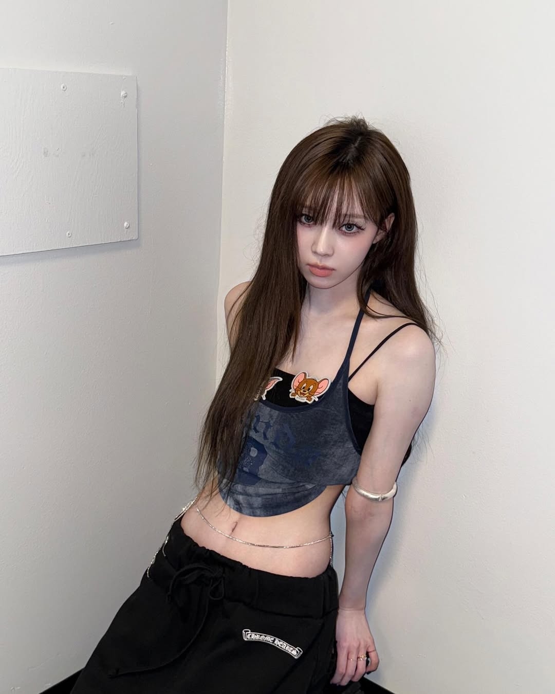 LE SSERAFIM成員采源擁有163cm身高,再加上僅17吋的驚人腰圍,常穿搭多以短版上衣為主,更突出腰線,下身再搭配高腰單品,視覺上整體比例亦拉長!