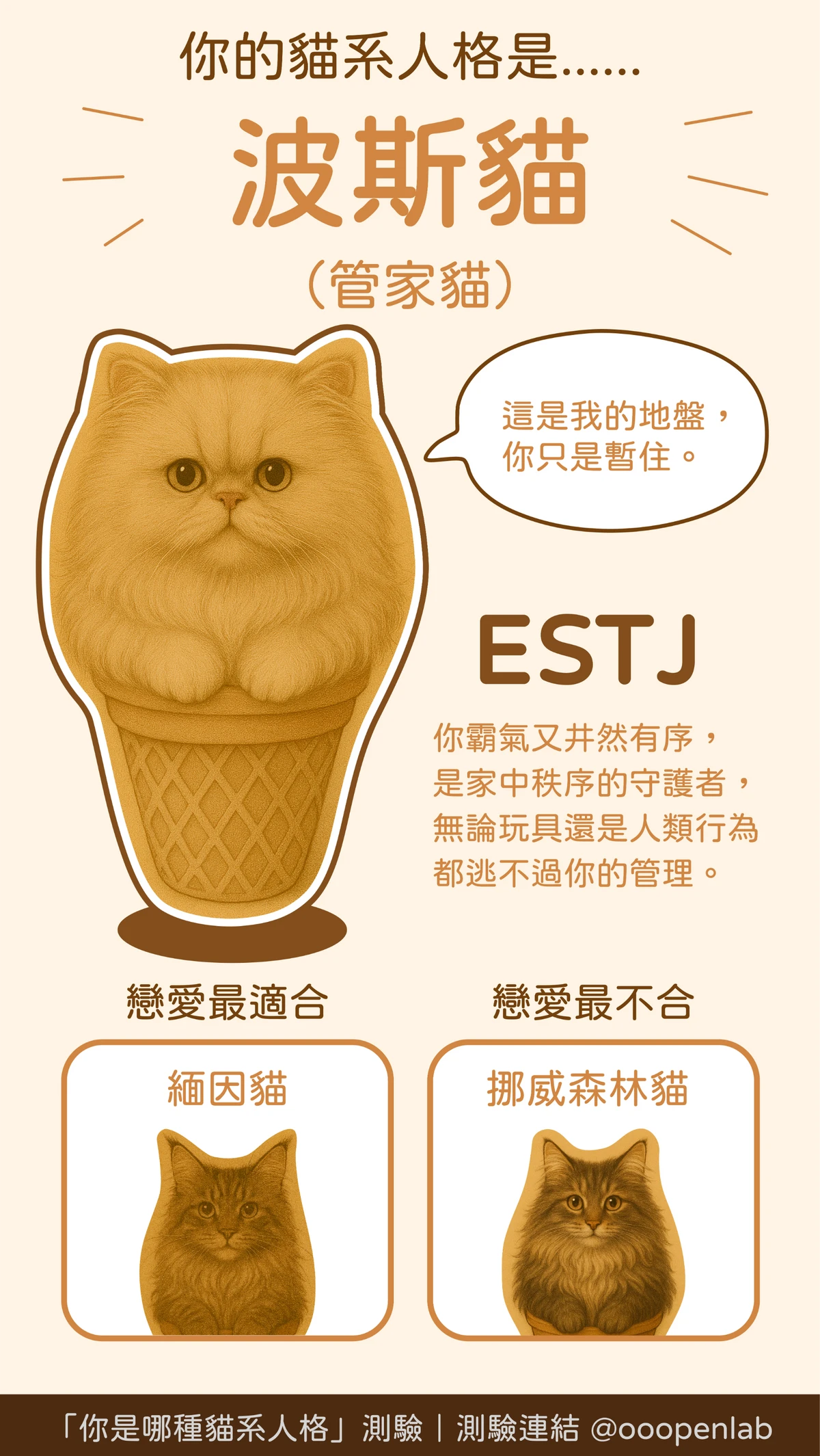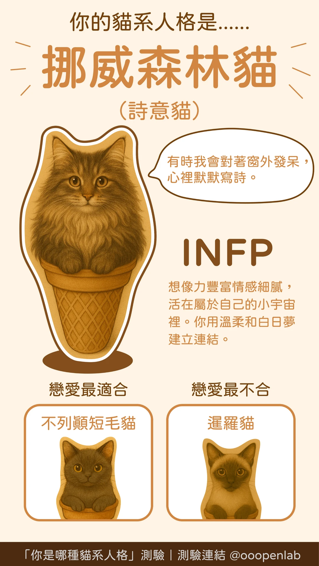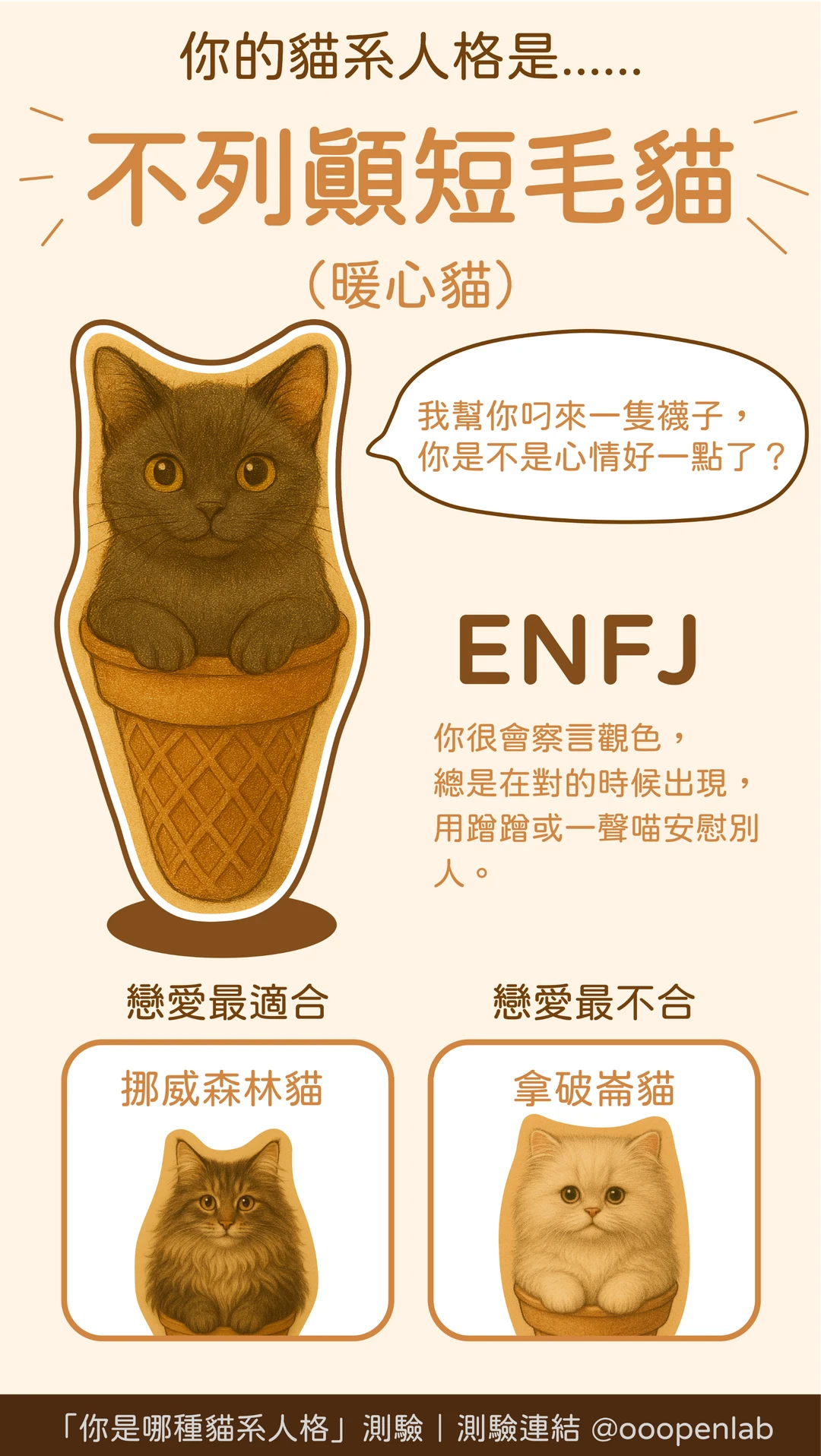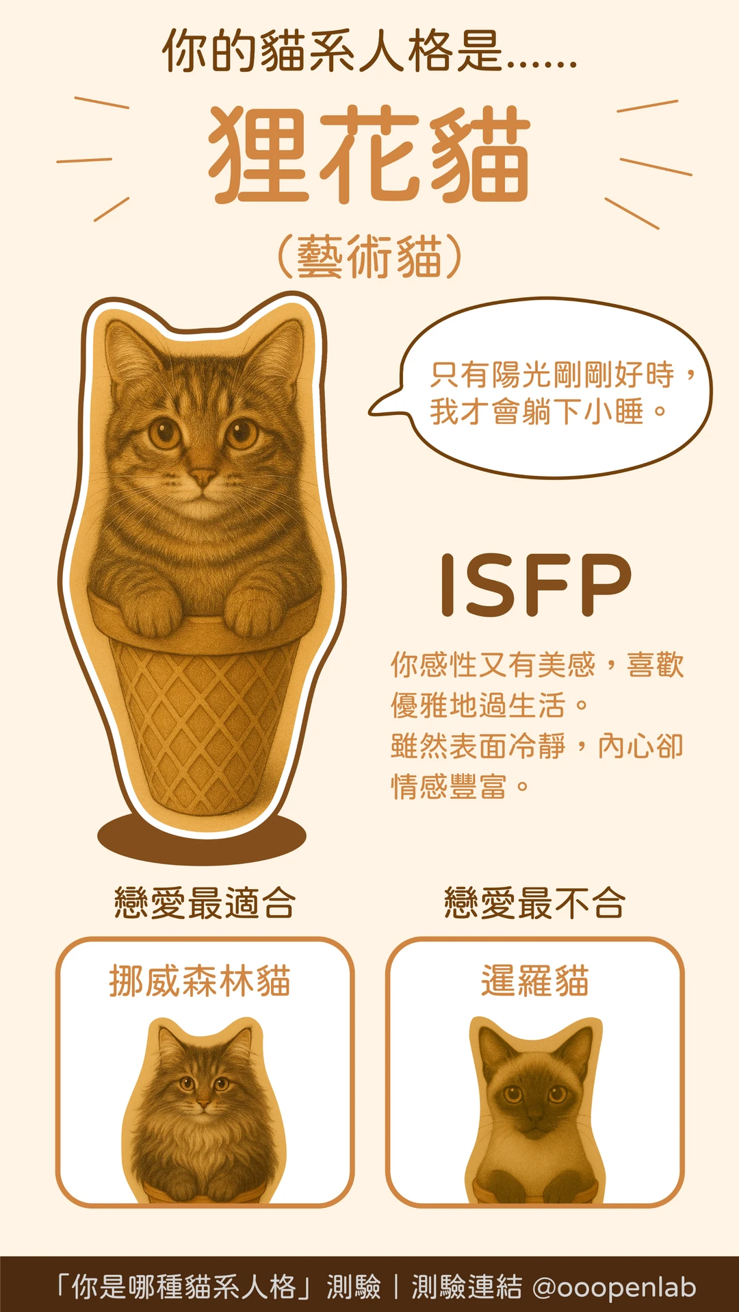 只要回答好以上8條題目,你就會收到一張超完整的結果圖,圖中會清楚測出你的「貓系人格」,而結果還會精準對應16種人格類型,搭配獨特的「戀愛雷達」、「旅行風格」與「合作搭檔建議」,讓你一次了解內在動力與理想夥伴。你也想知道結果?那麼就快點按這裡玩玩,找出你與哪隻貓靈魂相通吧!