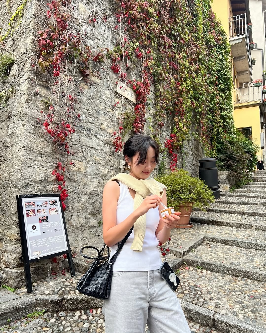 她巧妙地將基本款單品,如寬鬆帽Tee、牛仔褲和白色背心,搭配出不費力的時尚感。無論是戴著棒球帽的輕鬆裝扮,還是將針織衫隨性披在肩上,整體造型注重實用性與舒適度,同時又透露出她獨特的個人風格,完美詮釋了舒適與時尚並存的休閒魅力。