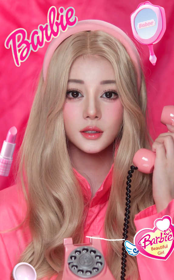 她成功地捕捉了迪麗熱巴深邃的眼部輪廓,透過加強眼線和睫毛,使雙眼更顯明亮有神。高挺的鼻樑和立體的顴骨也可能透過修容技巧進行了強化。而唇妝選擇了水潤的粉色系,為整體妝容增添了一抹芭比的甜美和俏皮感,將迪麗熱巴的明艷特質與芭比的夢幻可愛進行了融合,呈現出一個獨特且充滿活力的形象。