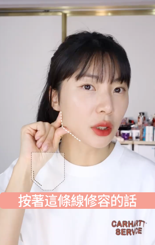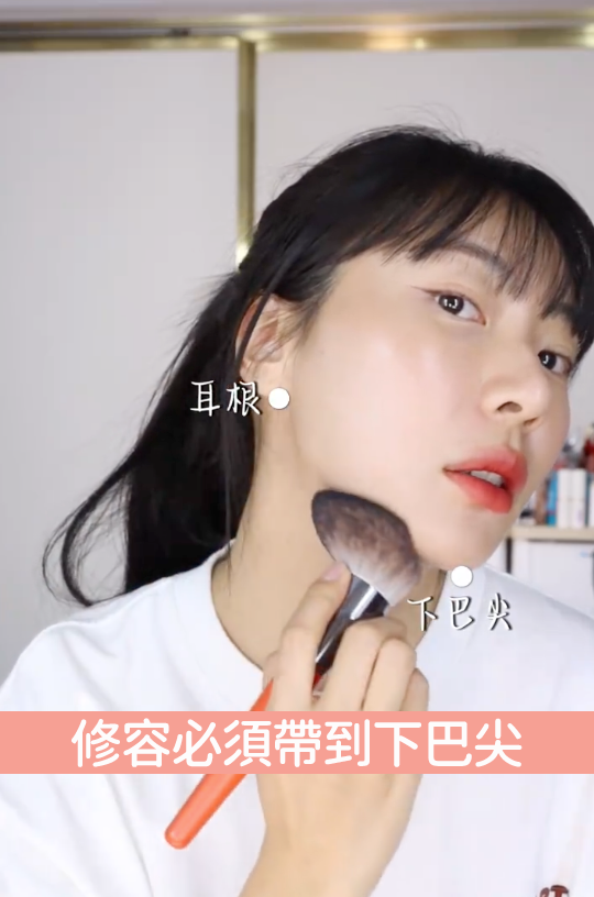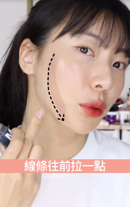 方臉的女生已經有明顯的下顎線,如果按著這條線修容,只會令棱角更明顯!大家可以將修容筆畫在棱角的下方,令到棱角與修容部分深淺一致,令棱角有縮入去的感覺~老師都特別提到方臉的女生修容自然一點可以,通過強調唇妝、眼妝及腮紅來分散對臉形的注意力!