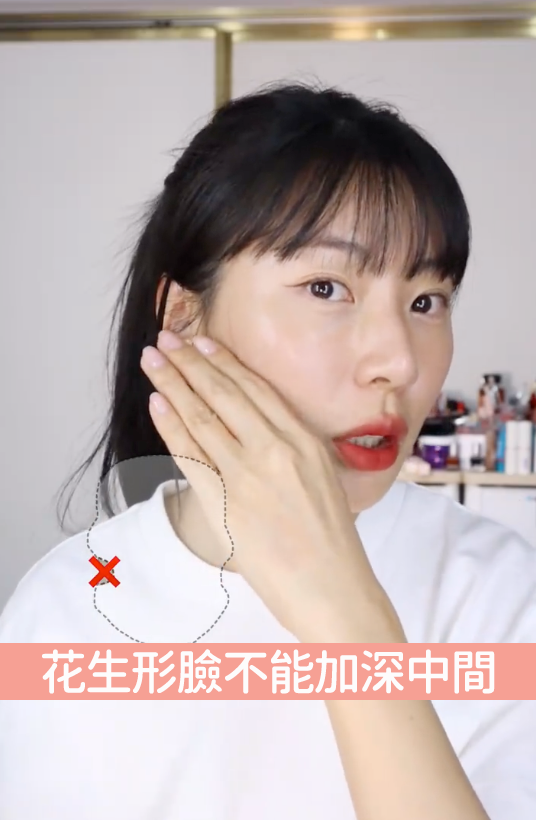 花生形臉即是太阳穴凹陷、颧骨突出的臉型~這類面型的女生,要記得在修容的時候,不能加深中間位置!可以用修容筆在顴骨位置打圈畫,下顎線位置斜向下畫,顴骨與下巴中間用比皮膚亮一度的高光,加深顴骨與下巴中間的位置!老師都有提到畫完修容會有分界線的人,是因為她們只修下顎線,要記得將修容粉帶到下巴尖~