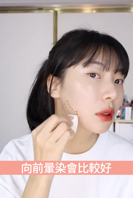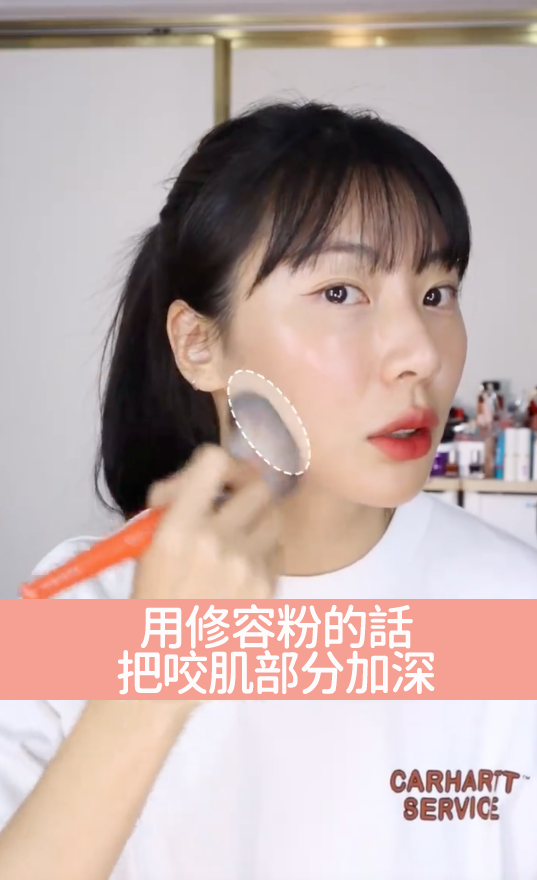 有時候明明四肢纖瘦,但包包面總是減不走,令人超煩惱!圓臉的女生可以用修容棒從顴骨到嘴角方向畫弧線,再慢慢向外拍開~用修容粉的話可以將咬肌部分加深,再拉到下巴位置;顴骨比較高的女生,可以在顴骨位置點壓拍開!