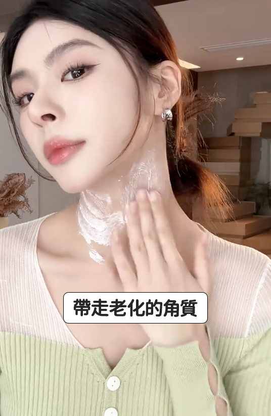 第二步:再用磨砂膏輕輕揉搓頸部,帶走老化的角質,然後擦乾淨