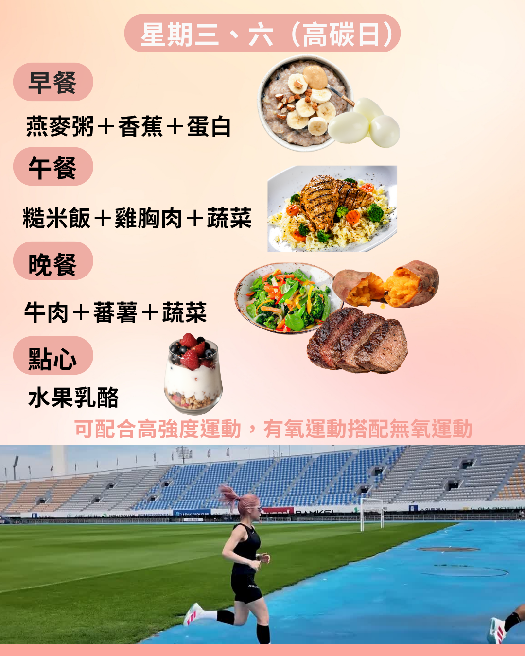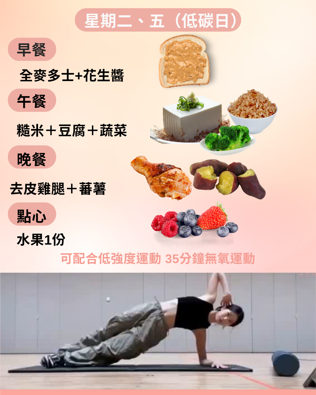 星期二、星期五(低碳日):每日攝取50-100克優質碳水,如蕃薯、粟米等,搭配高蛋白和健康脂肪。
