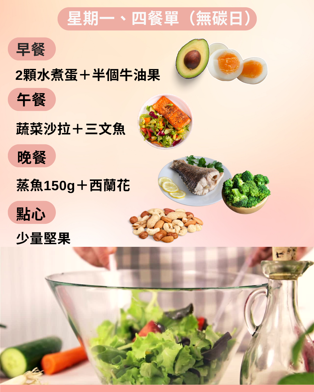 星期一、星期四(無碳日):不吃主食、澱粉類的食物,以蛋白質和蔬菜為主。