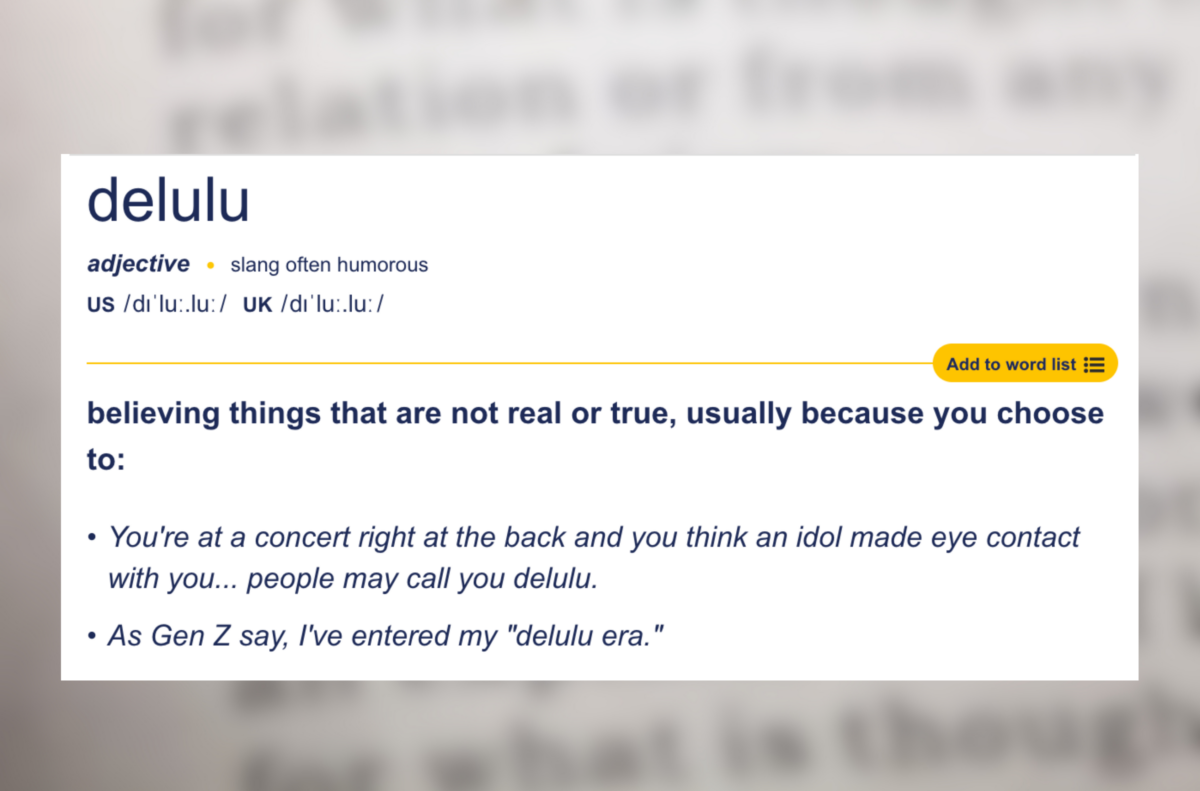 全寫是「delusional」,即「妄想的」。這個詞最初在粉絲圈裡流行,用來形容粉絲們對偶像抱持著不切實際的幻想,例如認為自己未來會嫁給偶像等。不過現在它的用法更廣泛,用來形容任何不理智、沉浸在自己幻想中的行為,通常帶點自嘲意味,比如「我的升職加薪願望雖然是 delulu,但還是要努力呀!」