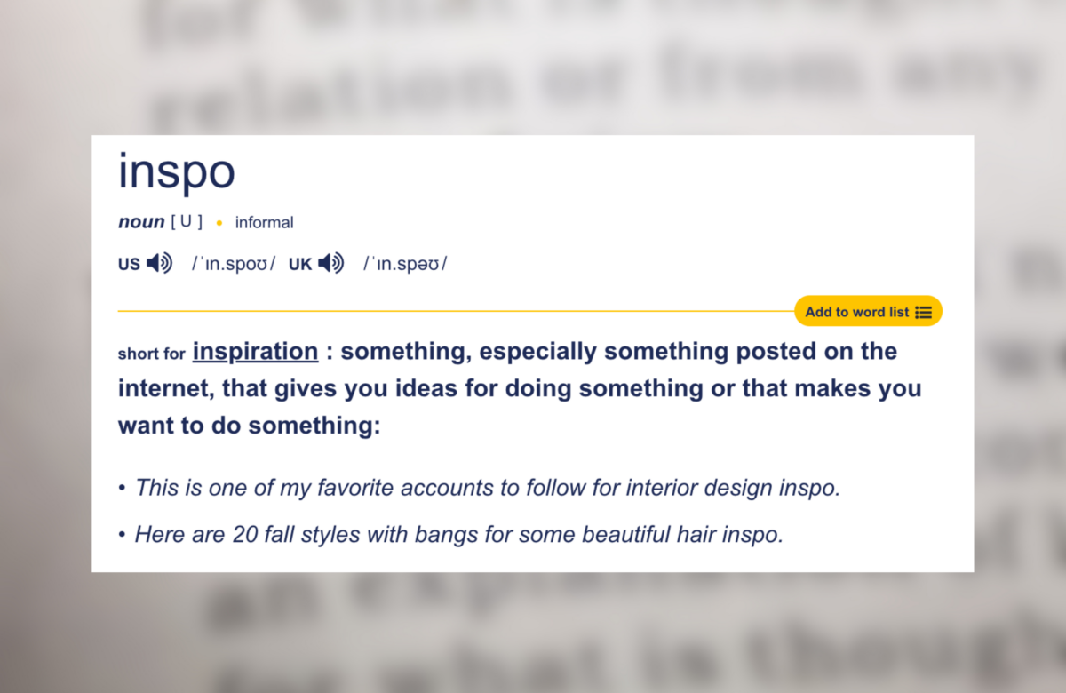 「inspo」全寫是「inspiration」,即「靈感」的意思。這個詞常見於 Instagram、Pinterest 等社交媒體,當你看到一張照片或一個穿搭,覺得特別有啟發性,就可以在留言裡說「inspo!」這個詞簡潔有力,用來表達你的欣賞和認可。
