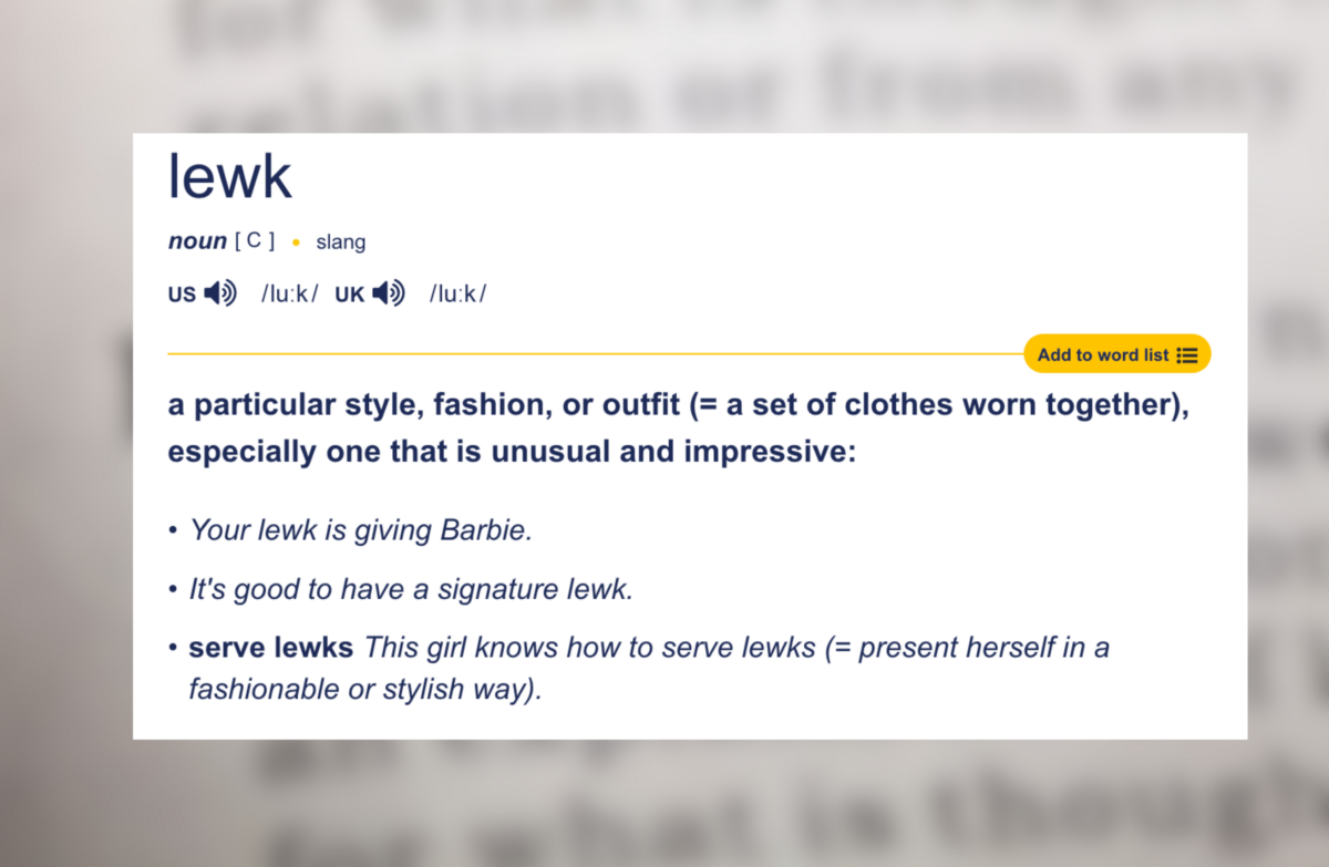 這是「look」的另一種寫法,但意思比單純的「外貌」更豐富。它通常用來形容一種精心設計、充滿個性的穿搭或造型,特別是在時尚圈或亞文化圈子裡流行。如果你朋友今天打扮得特別有型,你就可以讚他一句:「你今天的 lewk 超正!」