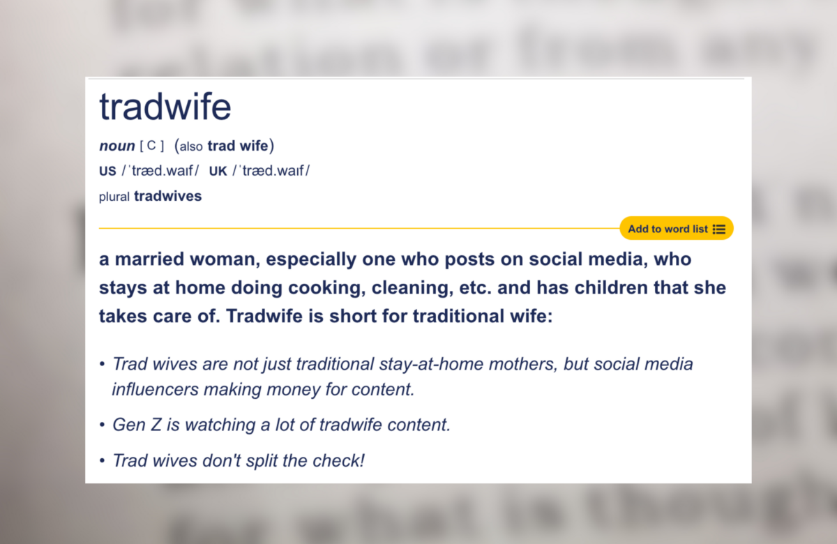 這是「traditional wife」的縮寫,通常指已婚女性,特別是那些在社交媒體上發文,強調自己留在家專注於煮食、清潔、照顧子女的角色。劍橋詞典表示「tradwife」這個詞反映一股在 Instagram 和 TikTok 上日益興盛、但具爭議性的「擁抱傳統性別角色」的潮流。