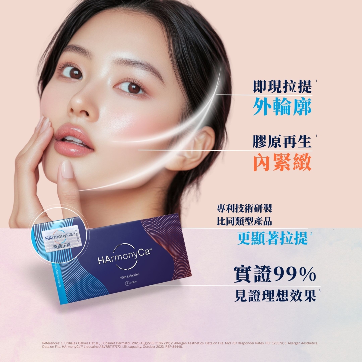每個女生都想擁有自然飽滿的臉頰,但隨住年齡的增長,膠原蛋白會更快流失,令面部顯得鬆弛,失去飽滿感,導致面型輪廓下垂、出現贅肉、笑紋²⁰,容易顯現疲倦老態的感覺~美編絕對不容許姊妹們的美貌愈變愈殘!所以美編私心會推介用HArmonyCa®美神針®療程,糅合兩大醫美元素²¹:以透明質酸一步到位做到即現提拉效果²²§ ,及以CaHA刺激持續膠原自生²²ˡˡ,持效展現緊緻彈性²²,無懼皮肉分離,輕鬆秒變女神,親和力UP,更獲99%用家見證緊緻效果²³~