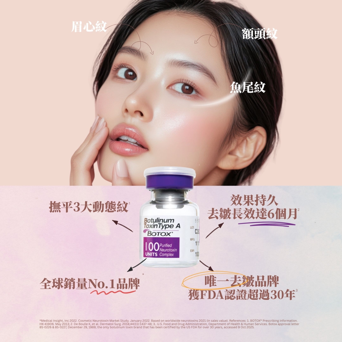 要改善整體膚質,除了補濕,抗皺保養亦不能省卻!出現3大表情紋會令視覺年齡上升,顏值下滑!比起各式各樣的抗皺精華,美編則推介搭配使用快捷、可直達肌膚深層肌肉的除皺小紫瓶¹²!BOTOX® 除了榮獲美國FDA認證超過30年¹³,至今銷量已累積超過1.5億瓶¹⁴,更是全球銷量No.1品牌¹⁵,而且精準度高¹⁶,能夠大大減低療程後臉部僵硬風險。若想改善動態紋的效果更佳,就要顧及周圍肌肉,建議「3點同步」治療 ,同時撫平額頭紋、眉心紋及魚尾紋¹⁷,以達到最協調的效果。最吸引的是一次療程後只需24小時就開始發揮功效¹⁸,4日即達100%改善¹⁸,快速去皺、擊退疲倦愁容之餘,給人瞬間年輕7年的感覺¹⁹,而且效果長效達6個⽉³,CP值極高!