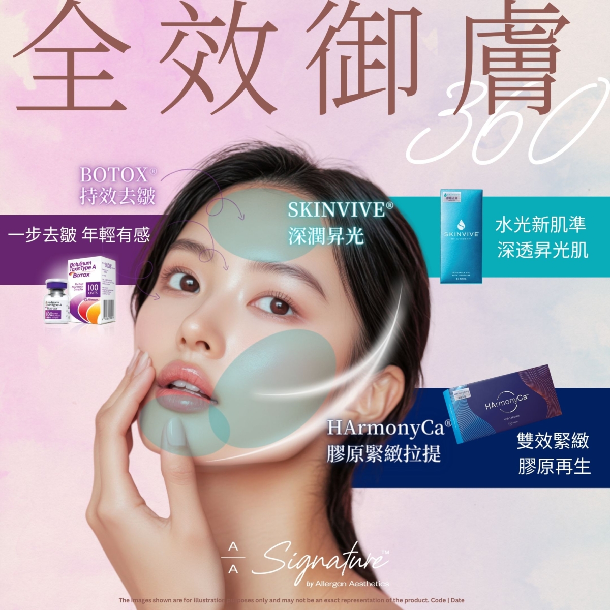 BOTOX®保妥適®(Botulinum Toxin Type A)藥品註冊編號: HK-41906. All adverse events should be reported to PVChina@abbvie.com. Product quality complaints should be reported to japac-pqc@abbvie.com. SKINVIVE by Juvéderm® (Hyaluronic Acid Gel with Lidocaine). HArmonyCa® (Calcium hydroxyapatite, hyaluronic acid gel with lidocaine). All adverse events should be reported to MedDeviceComplaintsAPAC@abbvie.com. The images shown are for illustration purposes only and may not be an exact representation of the product. Allergan Hong Kong Limited. Suite 2404, 24/F, AIA Tower, 183 Electric Road, North Point, Hong Kong. Tel: (852) 2610 2525. © 2025 Allergan Aesthetics. All rights reserved. HK-SIGSKIN-250001 I 17/NOV/25