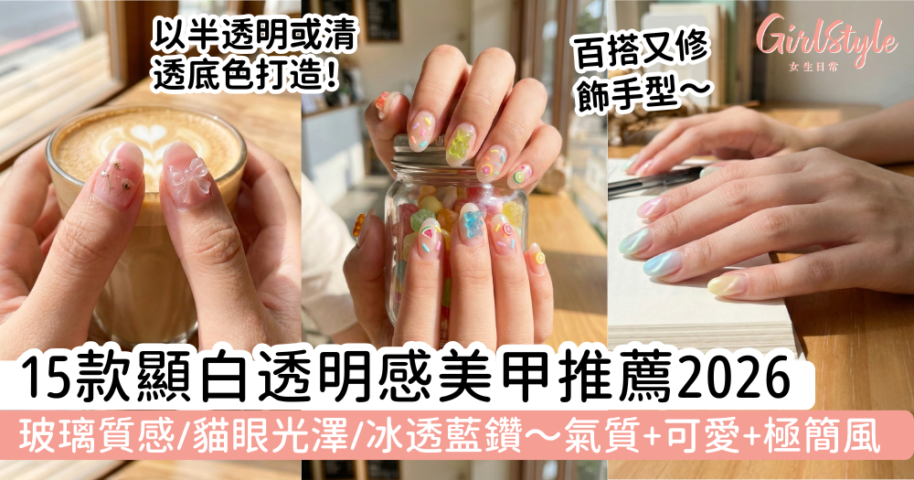 【透明感美甲2026】15款顯白美甲推薦:玻璃質感、貓眼光澤、冰透藍鑽|氣質、可愛、極簡風