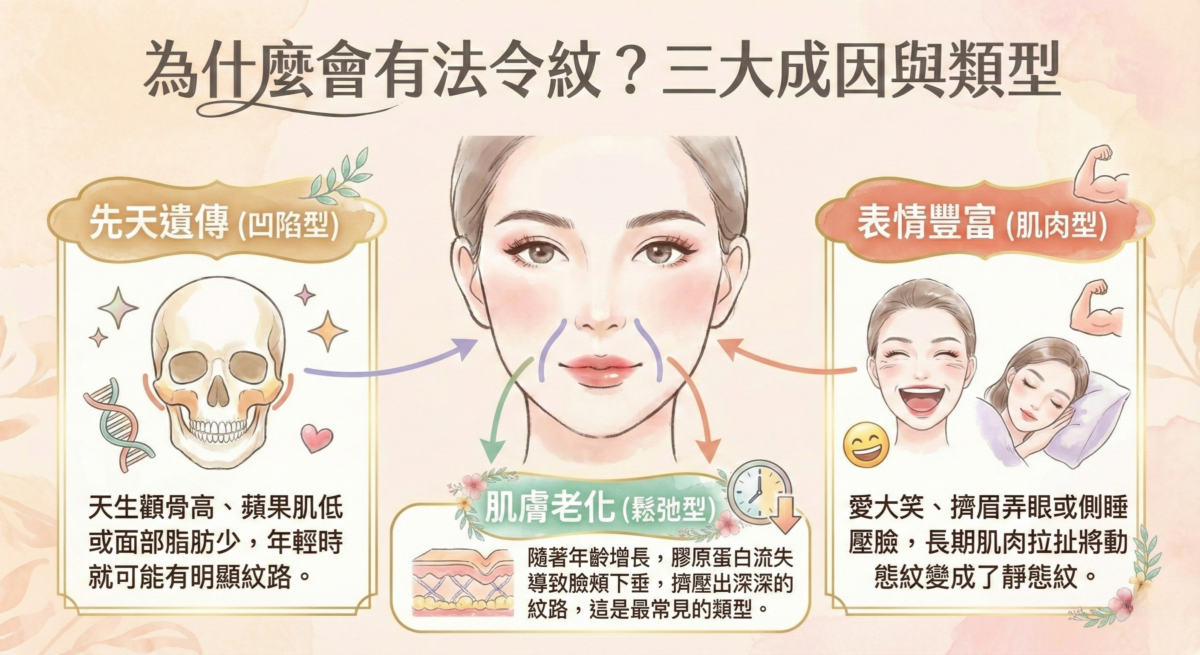 - 肌膚老化(鬆弛型):隨著年齡增長,膠原蛋白流失導致臉頰下垂,擠壓出深深的紋路,這是最常見的類型。