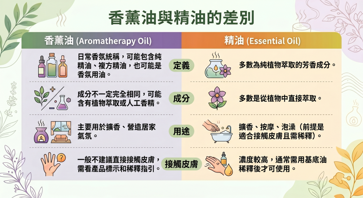 簡單來說,如果你只是想擴香、讓空間聞起來更舒服,香薰油通常已經很夠用;但如果你在意成分來源,或希望接觸皮膚使用,就要留意產品是否清楚標示為純精油,以及是否需要先稀釋。