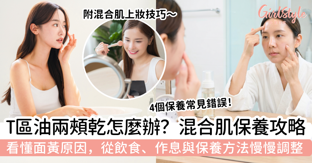 混合肌最常見是T區出油、兩頰乾燥,保養重點不是全臉控油或厚塗面霜,而是分區處理。T區以清爽控油、減少粉刺為主;兩頰則加強保濕和修護。只要按不同部位調整清潔、補水、防曬和上妝方式,油光、卡粉和乾燥問題都會慢慢改善。
