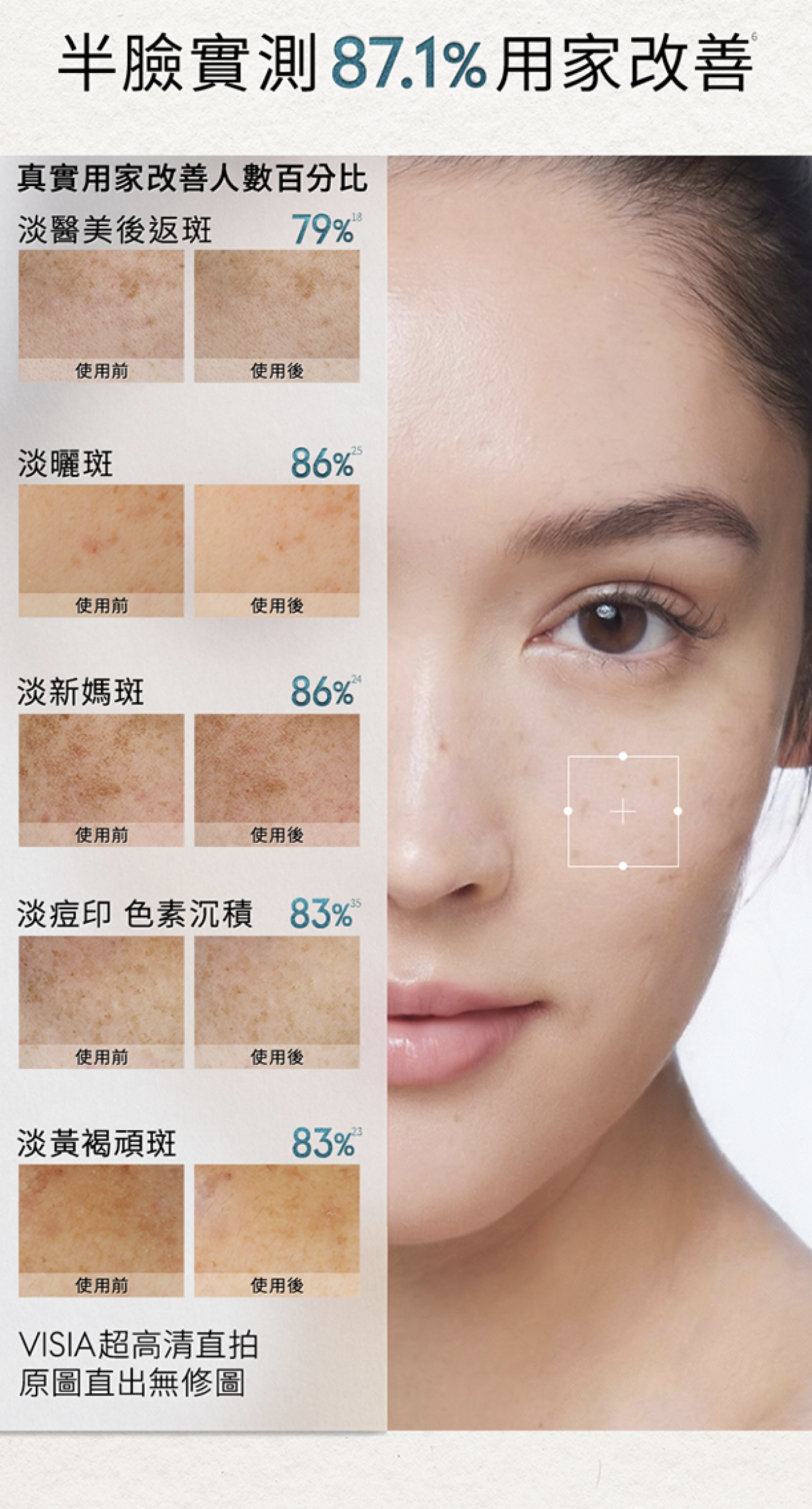 除了淡化深層色斑,它對於頑固的痘印同樣具有顯著的修復效果,能有效均勻局部暗沉。